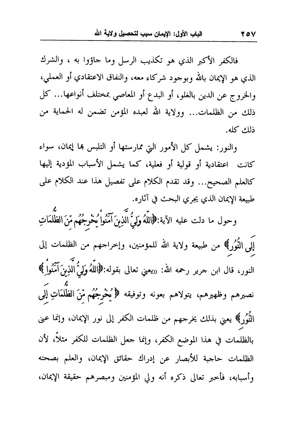 وحول ما دلت عليه الآية: {اللَّهُ وَلِيُّ الَّذِينَ آمَنُوا يُخْرِجُهُمْ مِنَ الظُّلُمَاتِ إِلَى النُّورِ} من طبيعة ولاية الله للمؤمنين، وإخراجهم من الظلمات إلى النور، قال ابن جرير رحمه الله: "يعني تعالى بقوله: {اللَّهُ وَلِيُّ الَّذِينَ آمَنُوا} نصيرهم وظهيرهم، يتولاهم بعونه وتوفيقه {يُخْرِجُهُمْ مِّنَ الظُّلُمَاتِ إِلَى النُّوُرِ} يعني بذلك يخرجهم من ظلمات الكفر إلى نور الإيمان، وإنما عنى بالظلمات في هذا الموضع الكفر، وإنما جعل الظلمات للكفر مثلاً، لأن الظلمات حاجبة للأبصار عن إدراك حقائق الإيمان، والعلم بصحته وأسبابه، فأخبر تعالى ذكره أنه ولي المؤمنين ومبصرهم حقيقة الإيمان،