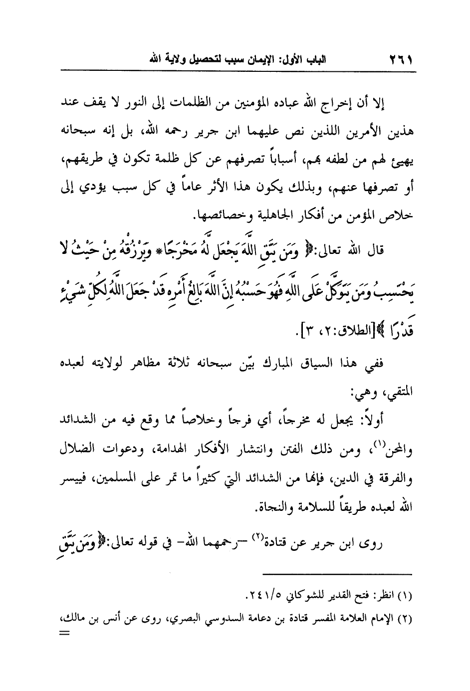 إلا أن إخراج الله عباده المؤمنين من الظلمات إلى النور لا يقف عند هذين الأمرين اللذين نص عليهما ابن جرير رحمه الله، بل إنه سبحانه يهيئ لهم من لطفه بهم، أسباباً تصرفهم عن كل ظلمة تكون في طريقهم، أو تصرفها عنهم، وبذلك يكون هذا الأثر عاماً في كل سبب يؤدي إلى خلاص المؤمن من أفكار الجاهلية وخصائصها.
