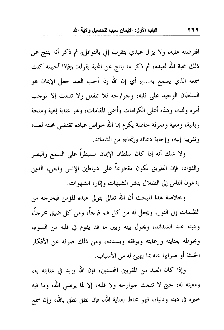 افترضته عليه، ولا يزال عبدي يتقرب إلي بالنوافل " ثم ذكر أنه ينتج عن ذلك محبة الله لعبده، ثم ذكر ما ينتج عن المحبة بقوله: " فإذا أحببته كنت سمعه الذي يسمع به ... " أي إن الله إذا أحب العبد جعل الإيمان هو السلطان الوحيد على قلبه، وجوارحه فلا تنفعل ولا تنبعث إلا لموجب أمره ونهيه، وهذه أعلى الكرامات وأسمى المقامات، وهو عناية إلهية ومنحة ربانية، ومعية ومعرفة خاصة يكرم بها الله خواص عباده تقتضي محبته لعبده وتقريبه إليه، وإجابة دعائه وإنجاءه من الشدائد.