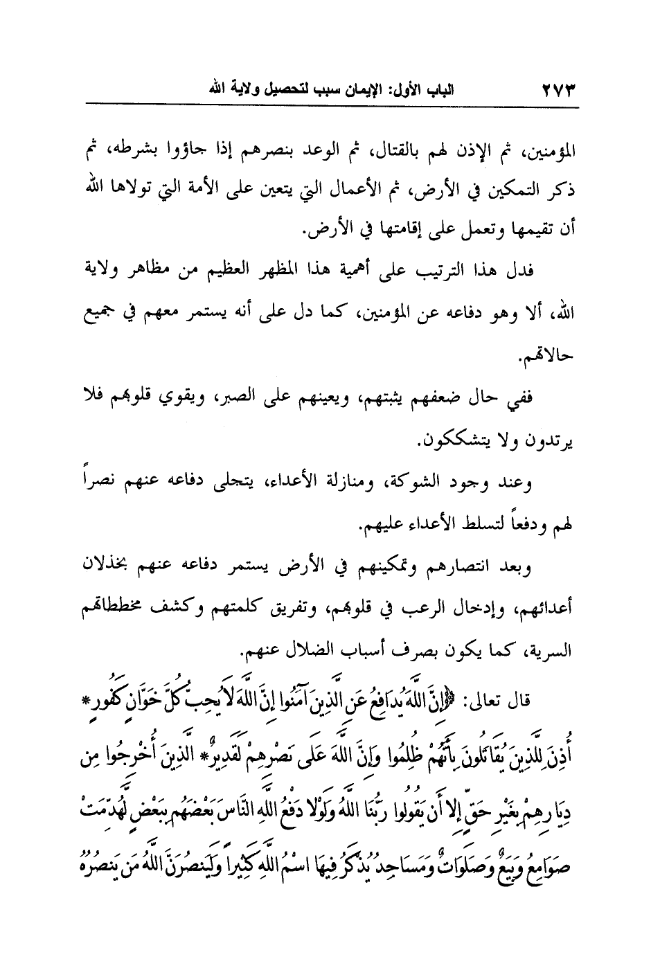 قال تعالى: {إِنَّ اللَّهَ يُدَافِعُ عَنِ الَّذِينَ آمَنُوا إِنَّ اللَّهَ لا يُحِبُّ كُلَّ خَوَّانٍ كَفُورٍ أُذِنَ لِلَّذِينَ يُقَاتَلُونَ بِأَنَّهُمْ ظُلِمُوا وَإِنَّ اللَّهَ عَلَى نَصْرِهِمْ لَقَدِيرٌ الَّذِينَ أُخْرِجُوا مِنْ دِيَارِهِمْ بِغَيْرِ حَقٍّ إِلاَّ أَنْ يَقُولُوا رَبُّنَا اللَّهُ وَلَوْلا دَفْعُ اللَّهِ النَّاسَ بَعْضَهُمْ بِبَعْضٍ لَهُدِّمَتْ صَوَامِعُ وَبِيَعٌ وَصَلَوَاتٌ وَمَسَاجِدُ يُذْكَرُ فِيهَا اسْمُ اللَّهِ كَثِيراً وَلَيَنْصُرَنَّ اللَّهُ مَنْ يَنْصُرُهُ