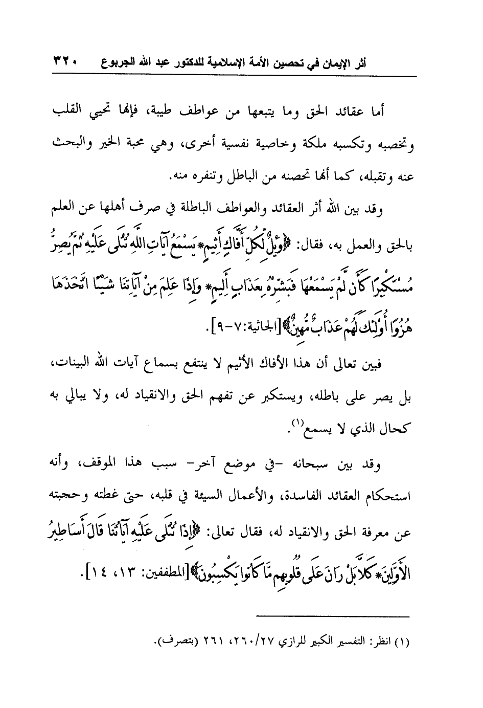وقد بين الله أثر العقائد والعواطف الباطلة في صرف أهلها عن العلم بالحق والعمل به، فقال: {وَيْلٌ لِكُلِّ أَفَّاكٍ أَثِيمٍ يَسْمَعُ آيَاتِ اللَّهِ تُتْلَى عَلَيْهِ ثُمَّ يُصِرُّ مُسْتَكْبِراً كَأَنْ لَمْ يَسْمَعْهَا فَبَشِّرْهُ بِعَذَابٍ أَلِيمٍ وَإِذَا عَلِمَ مِنْ آيَاتِنَا شَيْئاً اتَّخَذَهَا هُزُواً أُولَئِكَ لَهُمْ عَذَابٌ مُهِينٌ} الجاثية:7-9] .