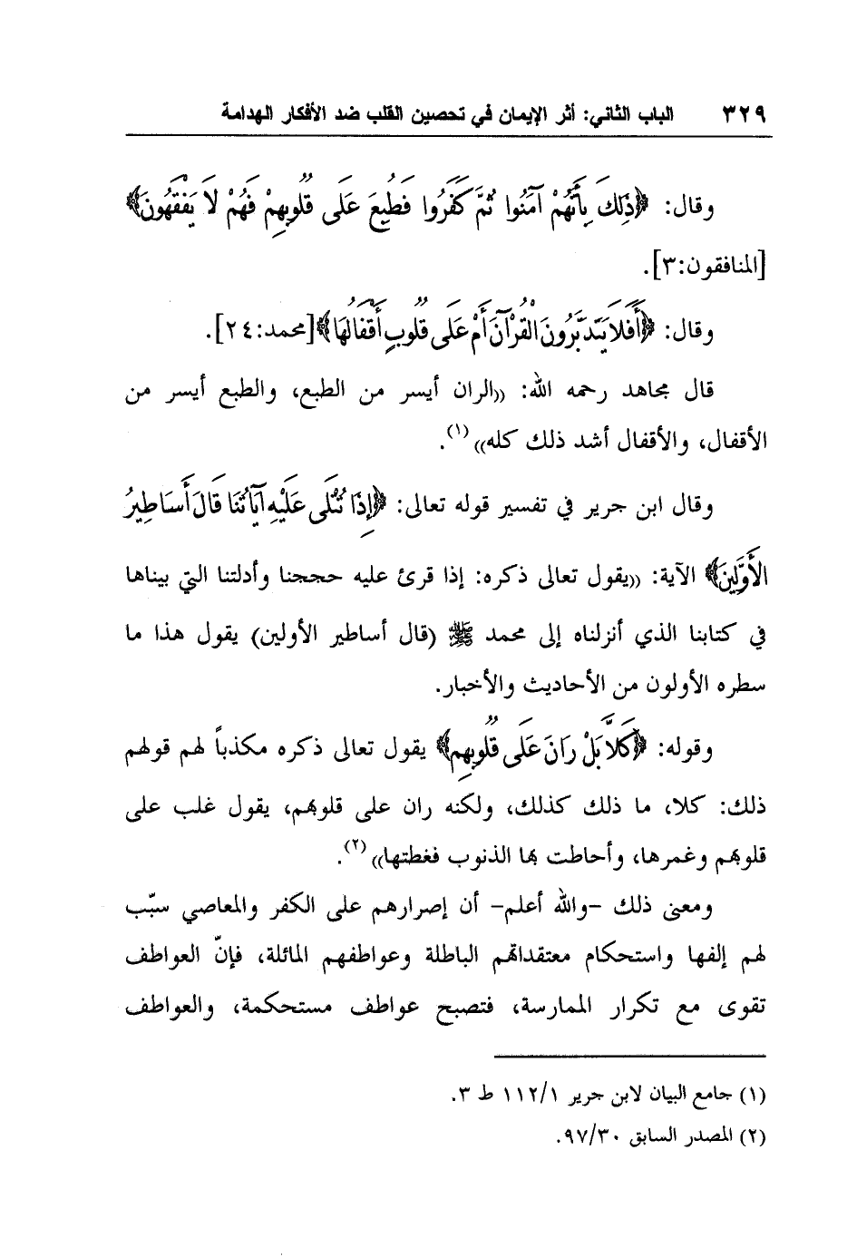 قال مجاهد رحمه الله: "الران أيسر من الطبع، والطبع أيسر من الأقفال، والأقفال أشد ذلك كله"1.