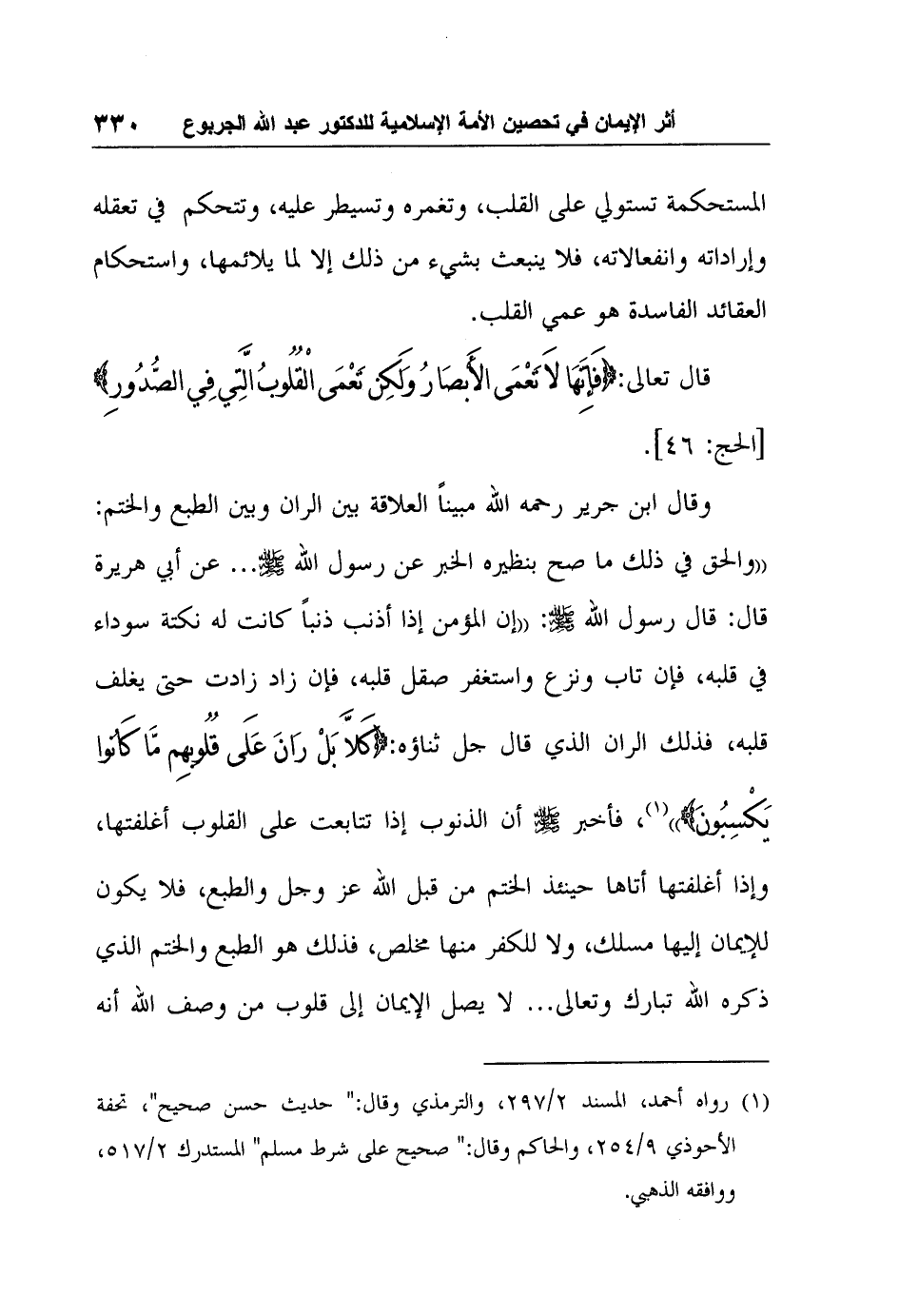 وقال ابن جرير رحمه الله مبيناً العلاقة بين الران وبين الطبع والختم: "والحق في ذلك ما صح بنظيره الخبر عن رسول الله صلى الله عليه وسلم ... عن أبي هريرة قال: قال رسول الله صلى الله عليه وسلم: " إن المؤمن إذا أذنب ذنباً كانت له نكتة سوداء في قلبه، فإن تاب ونزع واستغفر صقل قلبه، فإن زاد زادت حتى يغلف قلبه، فذلك الران الذي قال جل ثناؤه: {كَلاَّ بَلْ رَانَ عَلَى قُلُوبِهِمْ مَا كَانُوا يَكْسِبُونَ} "1، فأخبر صلى الله عليه وسلم أن الذنوب إذا تتابعت على القلوب أغلفتها، وإذا أغلفتها أتاها حينئذ الختم من قبل الله عز وجل والطبع، فلا يكون للإيمان إليها مسلك، ولا للكفر منها مخلص، فذلك هو الطبع والختم الذي ذكره الله تبارك وتعالى ... لا يصل الإيمان إلى قلوب من وصف الله أنه