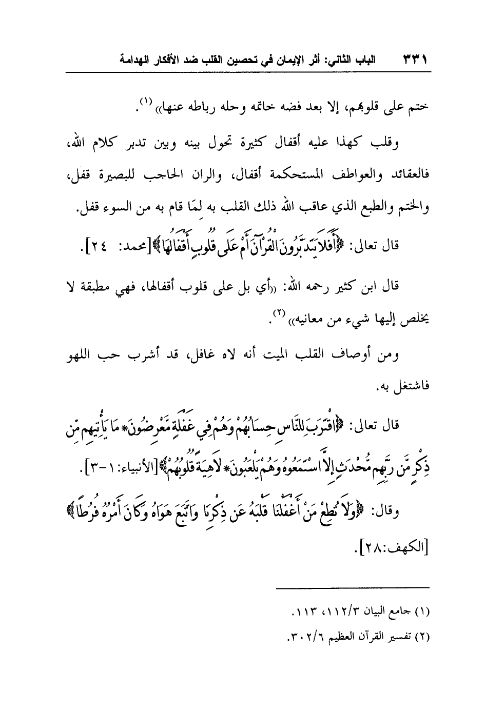 وقلب كهذا عليه أقفال كثيرة تحول بينه وبين تدبر كلام الله، فالعقائد والعواطف المستحكمة أقفال، والران الحاجب للبصيرة قفل، والختم والطبع الذي عاقب الله ذلك القلب به لِمَا قام به من السوء قفل. قال تعالى: {أَفَلا يَتَدَبَّرُونَ الْقُرْآنَ أَمْ عَلَى قُلُوبٍ أَقْفَالُهَا} [محمد: 24] .