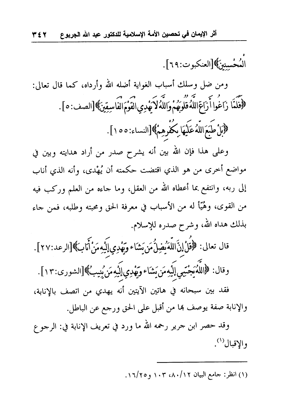 وقد حصر ابن جرير رحمه الله ما ورد في تعريف الإنابة في: الرجوع والإقبال1.
