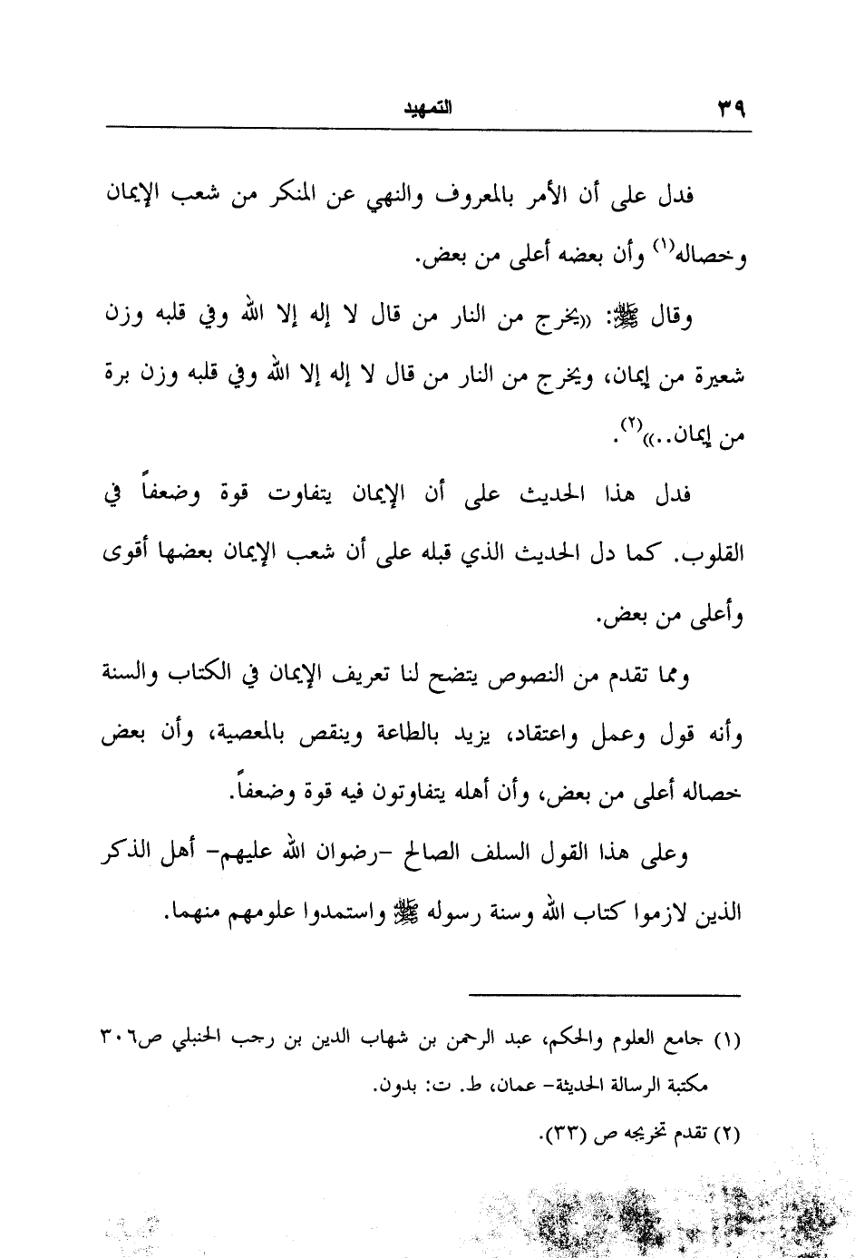 ومما تقدم من النصوص يتضح لنا تعريف الإيمان في الكتاب والسنة وأنه قول وعمل واعتقاد، يزيد بالطاعة وينقص بالمعصية، وأن بعض خصاله أعلى من بعض، وأن أهله يتفاوتون فيه قوة وضعفاً.
