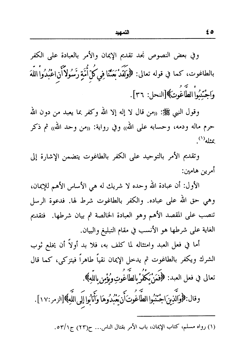 وتقديم الأمر بالتوحيد على الكفر بالطاغوت يتضمن الإشارة إلى أمرين هامين: