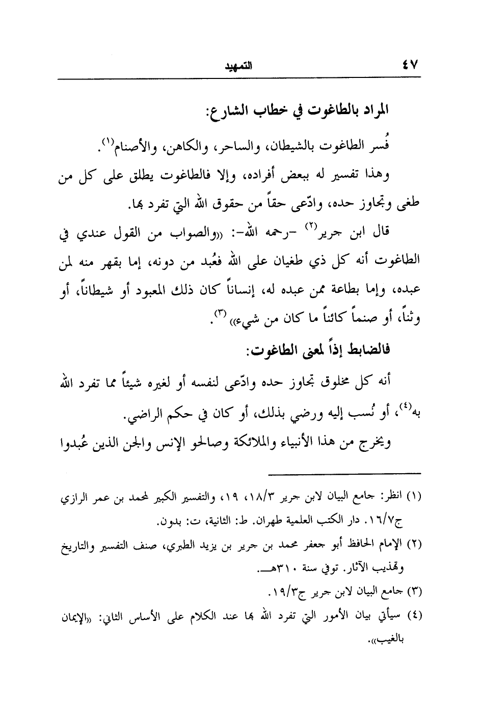 قال ابن جرير2 -رحمه الله-: "والصواب من القول عندي في الطاغوت أنه كل ذي طغيان على الله فعُبد من دونه، إما بقهر منه لمن عبده، وإما بطاعة ممن عبده له، إنساناً كان ذلك المعبود أو شيطاناً، أو وثناً، أو صنماً كائناً ما كان من شيء" 3.