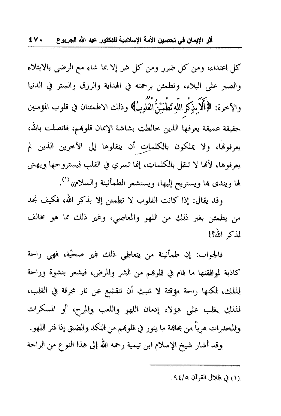 كل اعتداء، ومن كل ضرر ومن كل شر إلا بما شاء مع الرضى بالابتلاء والصبر على البلاء، وتطمئن برحمته في الهداية والرزق والستر في الدنيا والآخرة: {أَلاَ بِذِكْرِ اللهِ تَطْمَئِنُّ الْقُلُوبُ} وذلك الاطمئنان في قلوب المؤمنين حقيقة عميقة يعرفها الذين خالطت بشاشة الإيمان قلوبهم، فاتصلت بالله، يعرفونها، ولا يملكون بالكلمات أن ينقلوها إلى الآخرين الذين لم يعرفوها، لأنها لا تنقل بالكلمات، إنما تسري في القلب فيستروحها ويهش لها ويندى بها ويستريح إليها، ويستشعر الطمأنينة والسلام" 1.