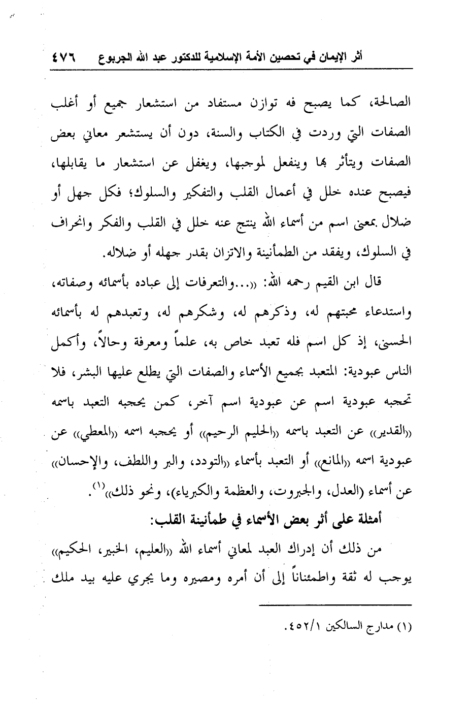 الصالحة، كما يصبح فه توازن مستفاد من استشعار جميع أو أغلب الصفات التي وردت في الكتاب والسنة، دون أن يستشعر معاني بعض الصفات ويتأثر بها وينفعل لموجبها، ويغفل عن استشعار ما يقابلها، فيصبح عنده خلل في أعمال القلب والتفكير والسلوك؛ فكل جهل أو ضلال بمعنى اسم من أسماء الله ينتج عنه خلل في القلب والفكر وانحراف في السلوك، ويفقد من الطمأنينة والاتزان بقدر جهله أو ضلاله.