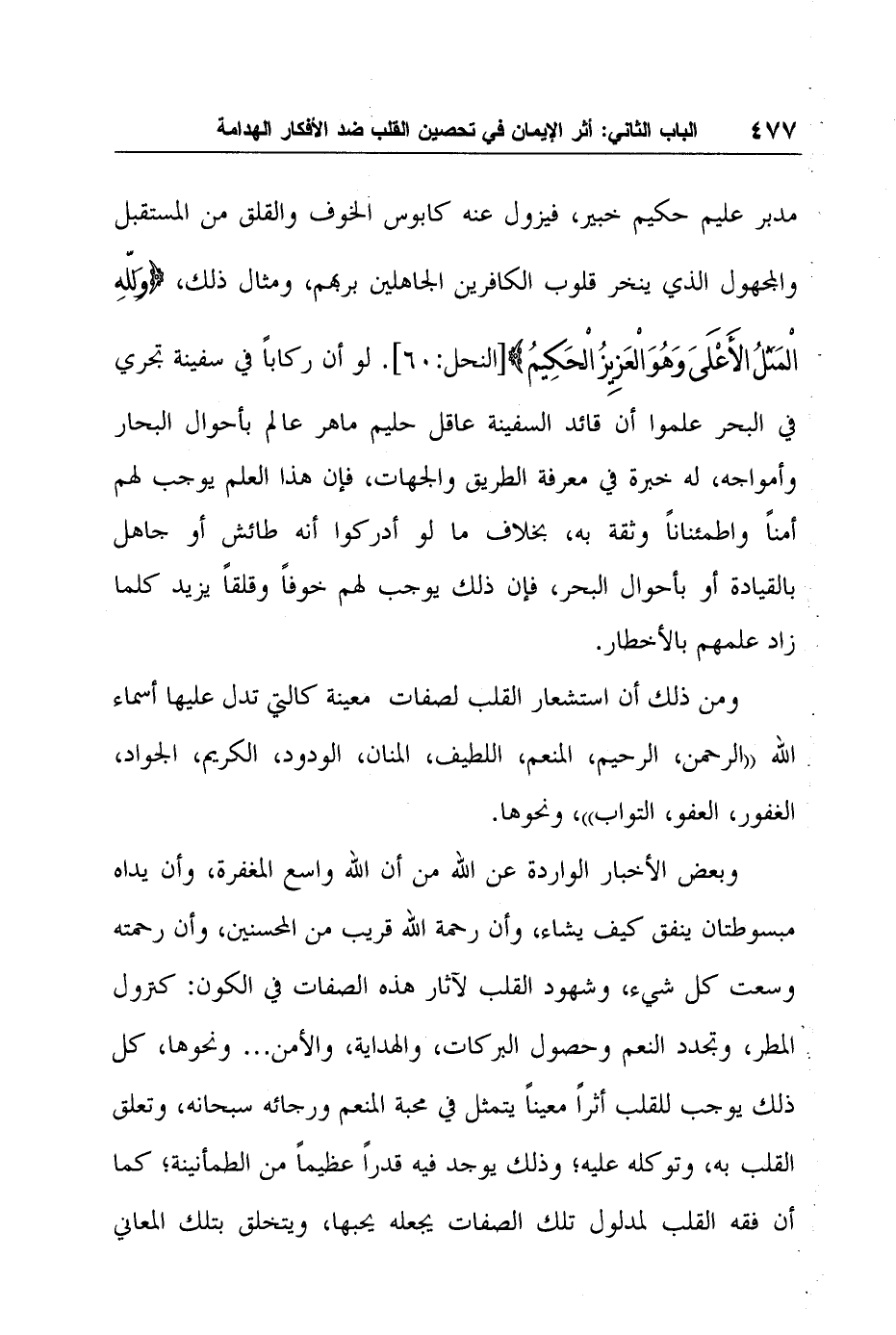 مدبر عليم حكيم خبير، فيزول عنه كابوس الخوف والقلق من المستقبل والمجهول الذي ينخر قلوب الكافرين الجاهلين بربهم، ومثال ذلك، {وَلِلَّهِ الْمَثَلُ الأَعْلَى وَهُوَ الْعَزِيزُ الْحَكِيمُ} [النحل:60] . لو أن ركاباً في سفينة تجري في البحر علموا أن قائد السفينة عاقل حليم ماهر عالم بأحوال البحار وأمواجه، له خبرة في معرفة الطريق والجهات، فإن هذا العلم يوجب لهم أمناً واطمئناناً وثقة به، بخلاف ما لو أدركوا أنه طائش أو جاهل بالقيادة أو بأحوال البحر، فإن ذلك يوجب لهم خوفاً وقلقاً يزيد كلما زاد علمهم بالأخطار.