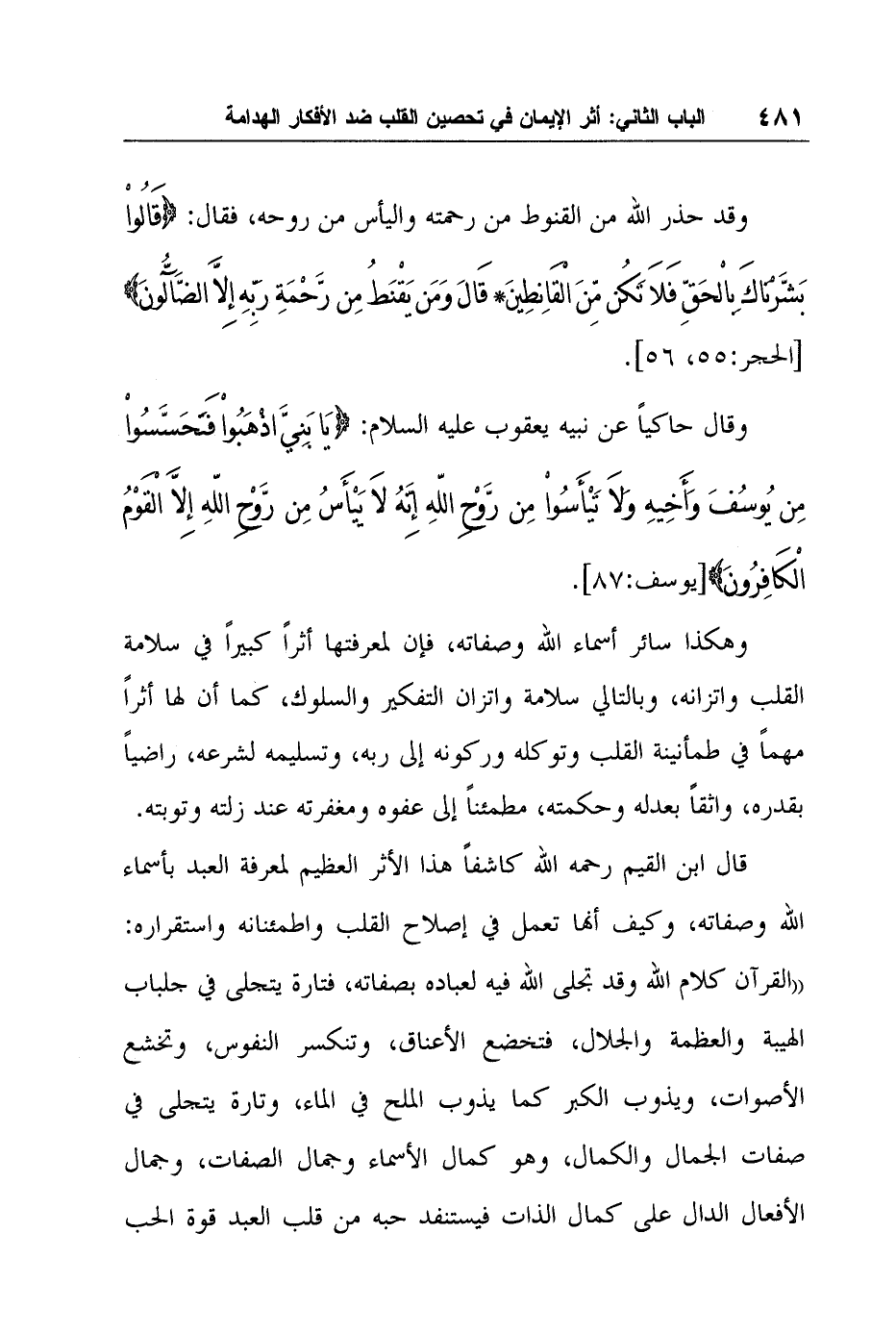 قال ابن القيم رحمه الله كاشفاً هذا الأثر العظيم لمعرفة العبد بأسماء الله وصفاته، وكيف أنها تعمل في إصلاح القلب واطمئنانه واستقراره: "القرآن كلام الله وقد تجلى الله فيه لعباده بصفاته، فتارة يتجلى في جلباب الهيبة والعظمة والجلال، فتخضع الأعناق، وتنكسر النفوس، وتخشع الأصوات، ويذوب الكبر كما يذوب الملح في الماء، وتارة يتجلى في صفات الجمال والكمال، وهو كمال الأسماء وجمال الصفات، وجمال الأفعال الدال على كمال الذات فيستنفد حبه من قلب العبد قوة الحب