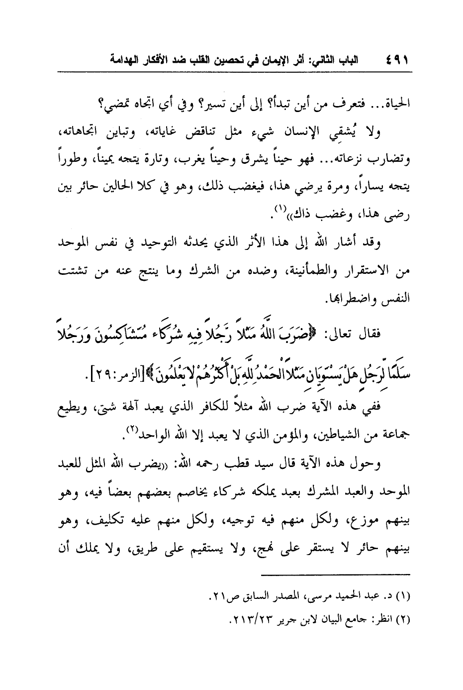 وحول هذه الآية قال سيد قطب رحمه الله: "يضرب الله المثل للعبد الموحد والعبد المشرك بعبد يملكه شركاء يخاصم بعضهم بعضاً فيه، وهو بينهم موزع، ولكل منهم فيه توجيه، ولكل منهم عليه تكليف، وهو بينهم حائر لا يستقر على نهج، ولا يستقيم على طريق، ولا يملك أن