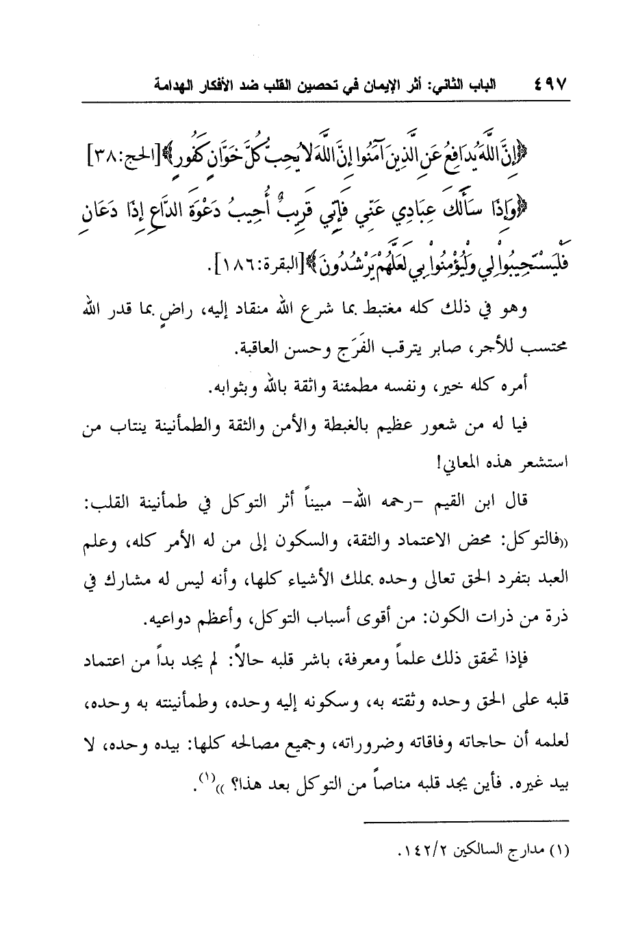 قال ابن القيم -رحمه الله- مبيناً أثر التوكل في طمأنينة القلب: "فالتوكل: محض الاعتماد والثقة، والسكون إلى من له الأمر كله، وعلم العبد بتفرد الحق تعالى وحده بملك الأشياء كلها، وأنه ليس له مشارك في ذرة من ذرات الكون: من أقوى أسباب التوكل، وأعظم دواعيه. فإذا تحقق ذلك علماً ومعرفة، باشر قلبه حالاً: لم يجد بداً من اعتماد قلبه على الحق وحده وثقته به، وسكونه إليه وحده، وطمأنينته به وحده، لعلمه أن حاجاته وفاقاته وضروراته، وجميع مصالحه كلها: بيده وحده، لا بيد غيره. فأين يجد قلبه مناصاً من التوكل بعد هذا؟ "1.