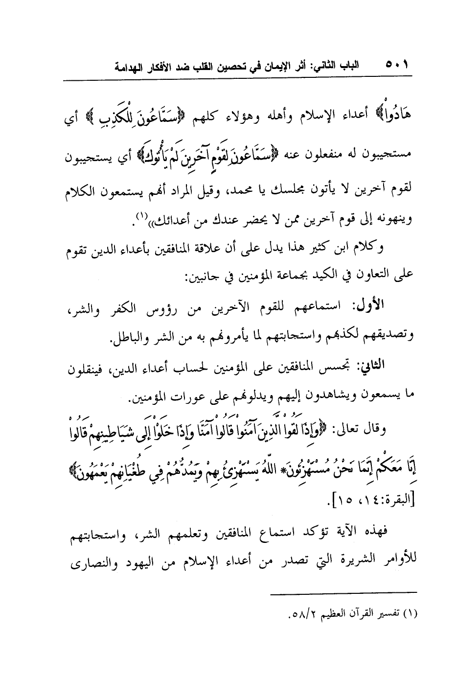 وكلام ابن كثير هذا يدل على أن علاقة المنافقين بأعداء الدين تقوم على التعاون في الكيد بجماعة المؤمنين في جانبين: