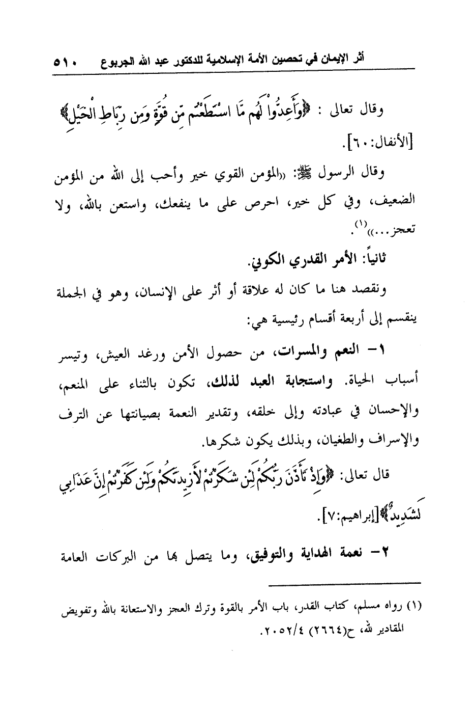 1 رواه مسلم، كتاب القدر، باب الأمر بالقوة وترك العجز والاستعانة بالله وتفويض المقادير لله، ح2664 4/2052.