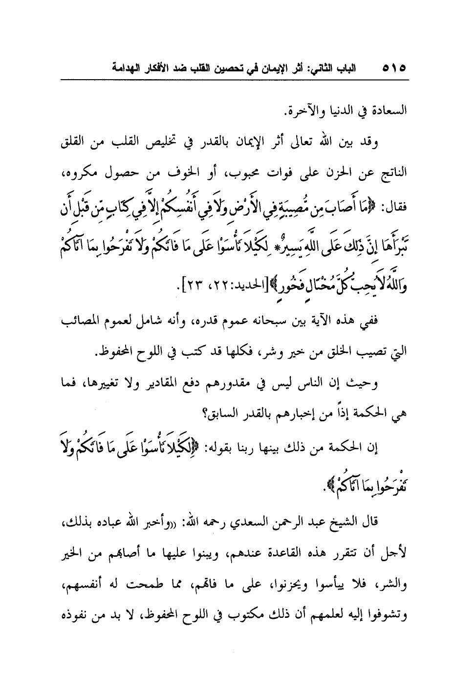 قال الشيخ عبد الرحمن السعدي رحمه الله: "وأخبر الله عباده بذلك، لأجل أن تتقرر هذه القاعدة عندهم، ويبنوا عليها ما أصابهم من الخير والشر، فلا ييأسوا ويحزنوا، على ما فاتهم، مما طمحت له أنفسهم، وتشوفوا إليه لعلمهم أن ذلك مكتوب في اللوح المحفوظ، لا بد من نفوذه