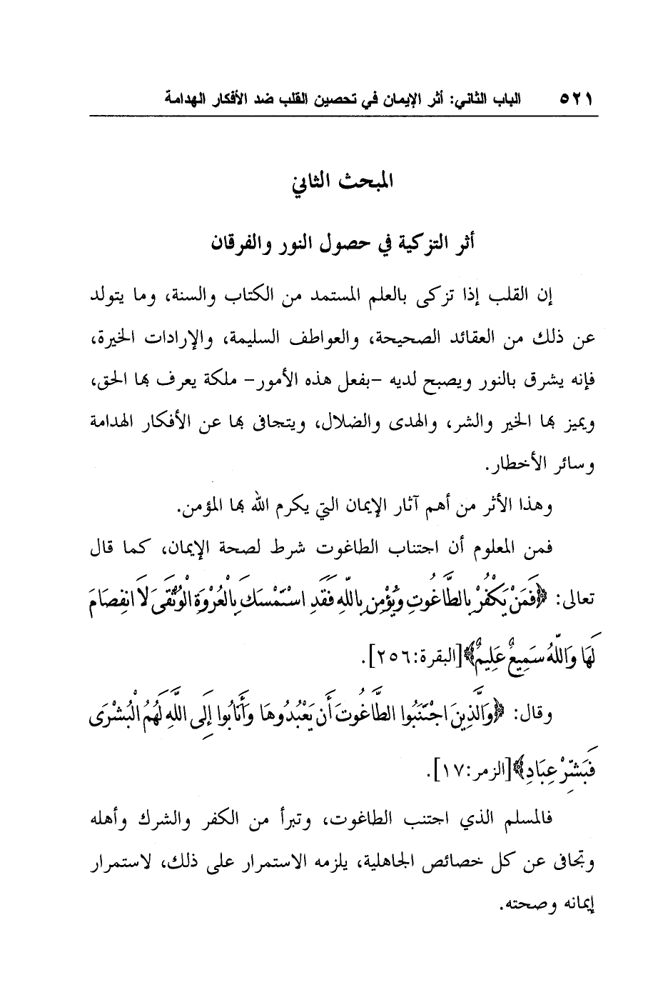 إن القلب إذا تزكى بالعلم المستمد من الكتاب والسنة، وما يتولد عن ذلك من العقائد الصحيحة، والعواطف السليمة، والإرادات الخيرة، فإنه يشرق بالنور ويصبح لديه -بفعل هذه الأمور- ملكة يعرف بها الحق، ويميز بها الخير والشر، والهدى والضلال، ويتجافى بها عن الأفكار الهدامة وسائر الأخطار.