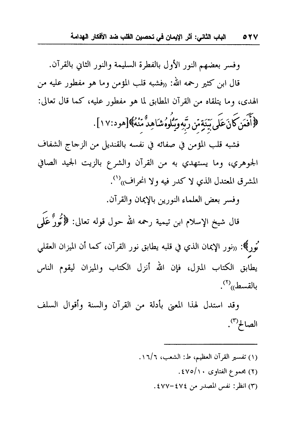 قال ابن كثير رحمه الله: "فشبه قلب المؤمن وما هو مفطور عليه من الهدى، وما يتلقاه من القرآن المطابق لما هو مفطور عليه، كما قال تعالى: {أَفَمَنْ كَانَ عَلَى بَيِّنَةٍ مِنْ رَبِّهِ وَيَتْلُوهُ شَاهِدٌ مِنْهُ} [هود:17] . فشبه قلب المؤمن في صفائه في نفسه بالقنديل من الزجاج الشفاف الجوهري، وما يستهدي به من القرآن والشرع بالزيت الجيد الصافي المشرق المعتدل الذي لا كدر فيه ولا انحراف"1.