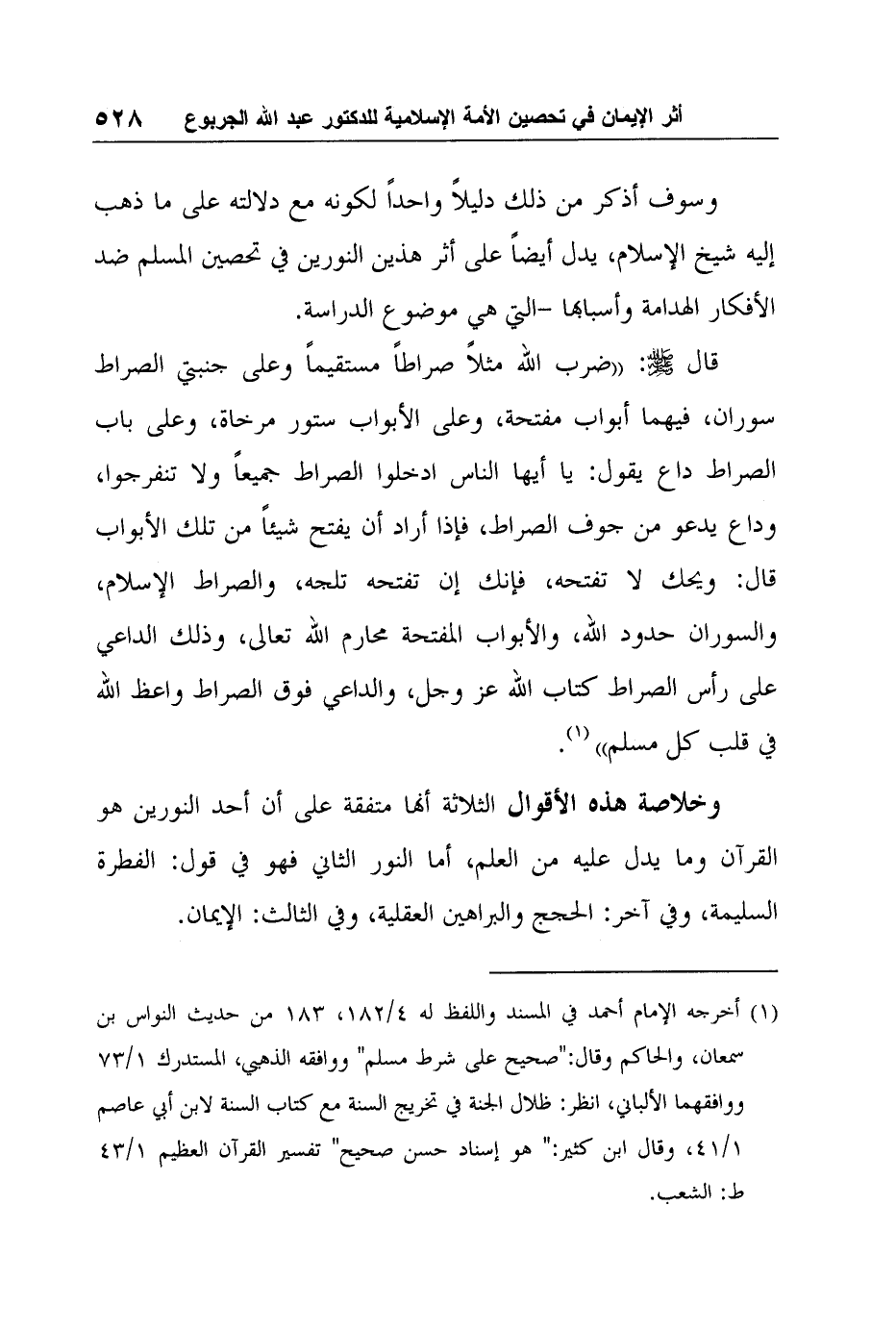 وسوف أذكر من ذلك دليلاً واحداً لكونه مع دلالته على ما ذهب إليه شيخ الإسلام، يدل أيضاً على أثر هذين النورين في تحصين المسلم ضد الأفكار الهدامة وأسبابها -التي هي موضوع الدراسة.