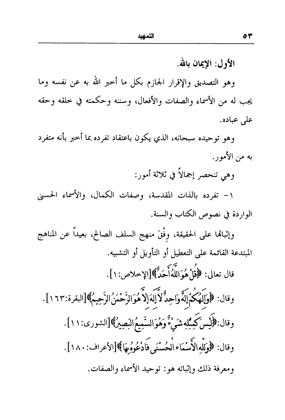 1- تفرده بالذات المقدسة، وصفات الكمال، والأسماء الحسنى الواردة في نصوص الكتاب والسنة.