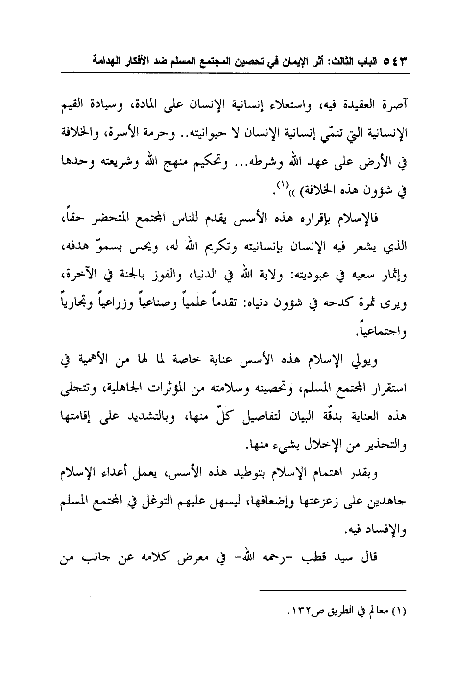آصرة العقيدة فيه، واستعلاء إنسانية الإنسان على المادة، وسيادة القيم الإنسانية التي تنمّي إنسانية الإنسان لا حيوانيته.. وحرمة الأسرة، والخلافة في الأرض على عهد الله وشرطه ... وتحكيم منهج الله وشريعته وحدها في شؤون هذه الخلافة "1.
