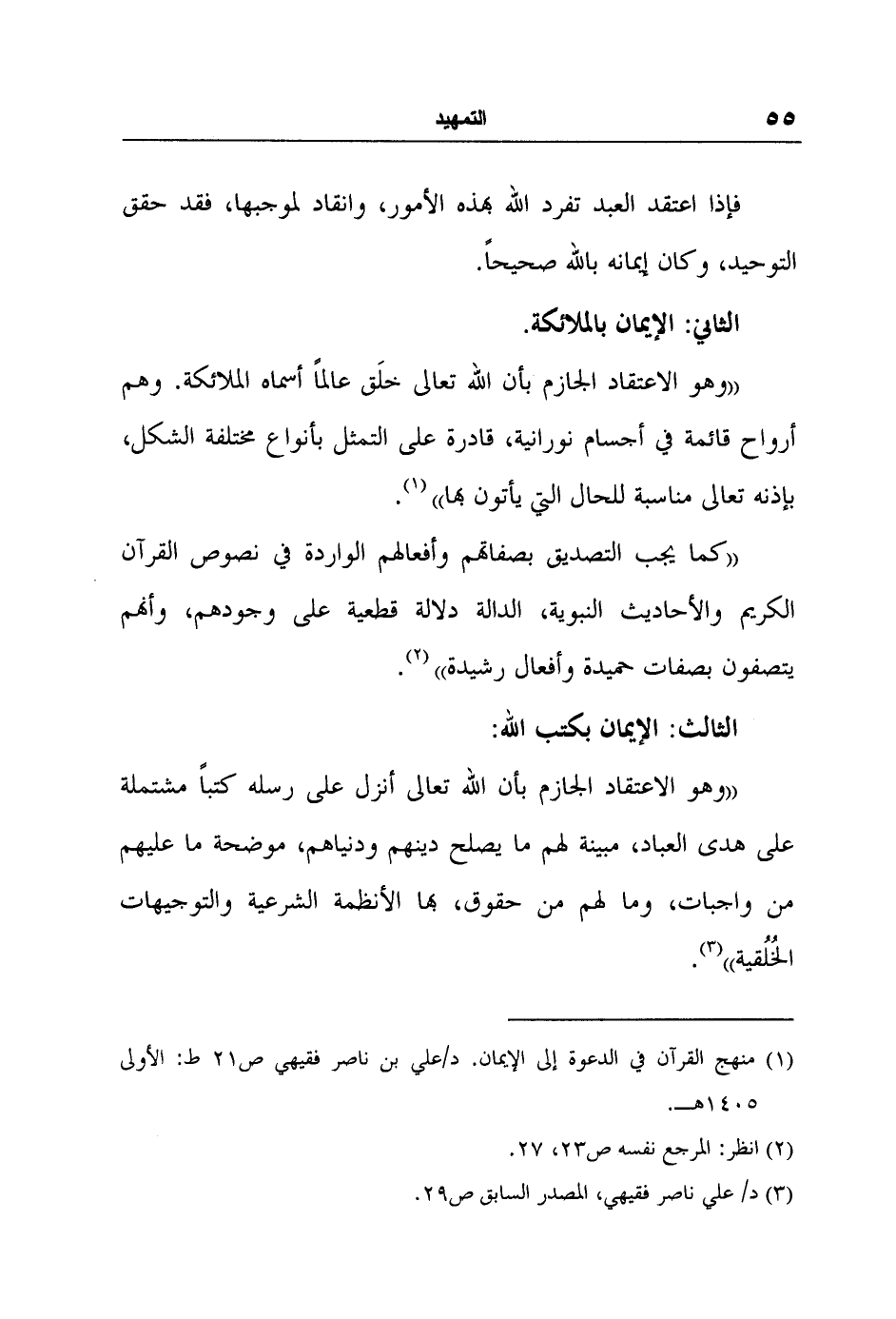 "كما يجب التصديق بصفاتهم وأفعالهم الواردة في نصوص القرآن الكريم والأحاديث النبوية، الدالة دلالة قطعية على وجودهم، وأنهم يتصفون بصفات حميدة وأفعال رشيدة" 2.