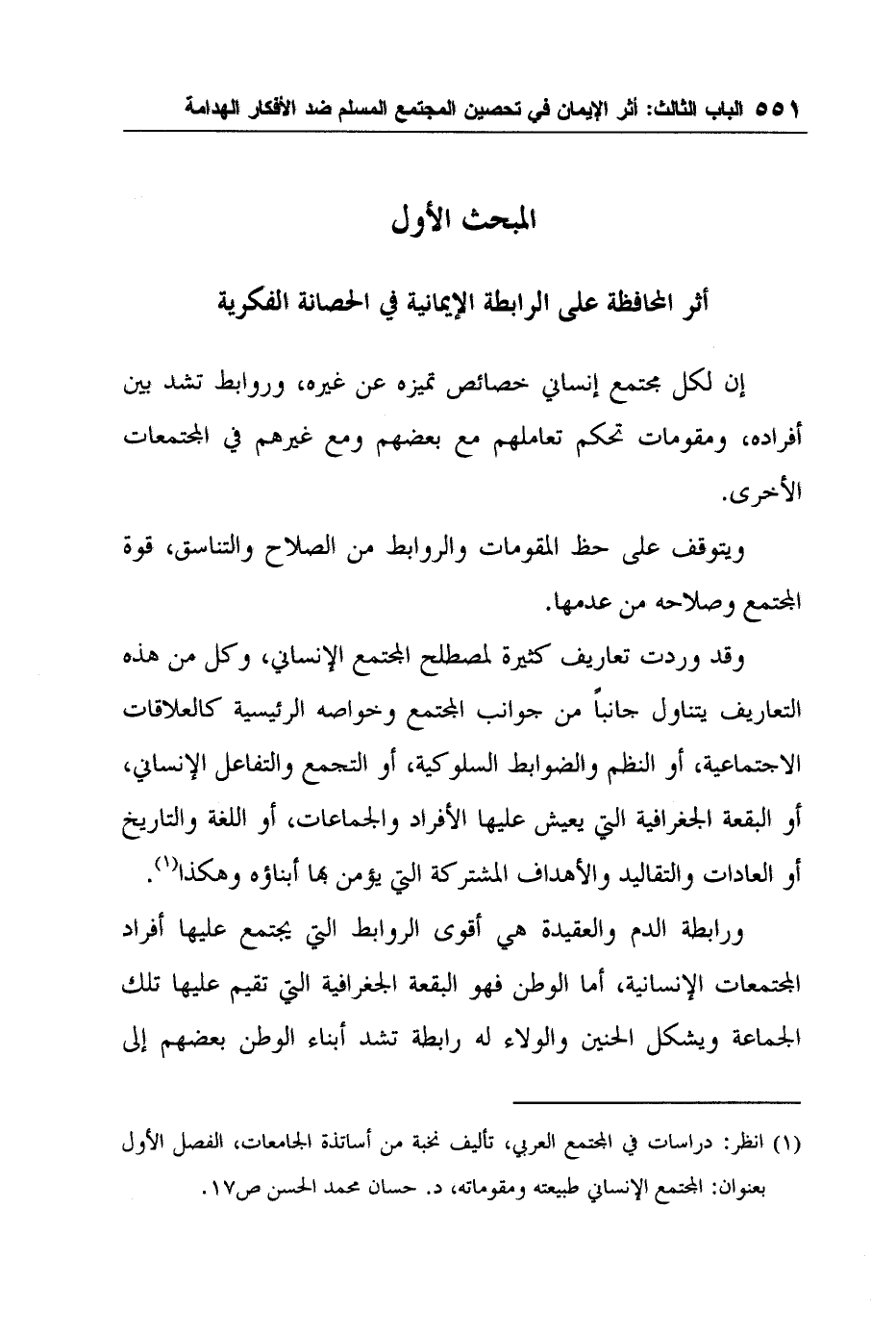 1 انظر: دراسات في المجتمع العربي، تأليف نخبة من أساتذة الجامعات، الفصل الأول بعنوان: المجتمع الإنساني طبيعته ومقوماته، د. حسان محمد الحسن ص17.