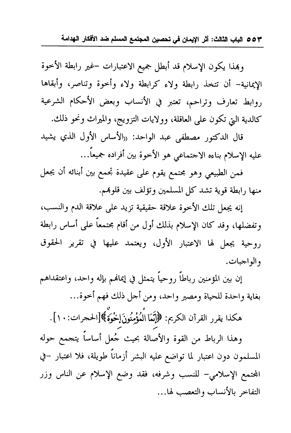 قال الدكتور مصطفى عبد الواحد: "الأساس الأول الذي يشيد عليه الإسلام بناءه الاجتماعي هو الأخوة بين أفراده جميعاً ... فمن الطبيعي وهو مجتمع يقوم على عقيدة تجمع بين أبنائه أن يجعل منها رابطة قوية تشد كل المسلمين وتؤلف بين قلوبهم.