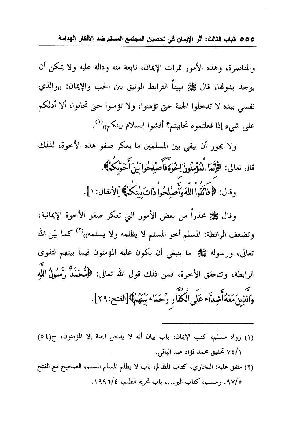 والمناصرة، وهذه الأمور ثمرات الإيمان، نابعة منه ودالة عليه ولا يمكن أن يوجد بدونها، قال صلى الله عليه وسلم مبيناً الترابط الوثيق بين الحب والإيمان: " والذي نفسي بيده لا تدخلوا الجنة حتى تؤمنوا، ولا تؤمنوا حتى تحابوا، ألا أدلكم على شيء إذا فعلتموه تحاببتم؟ أفشوا السلام بينكم "1.