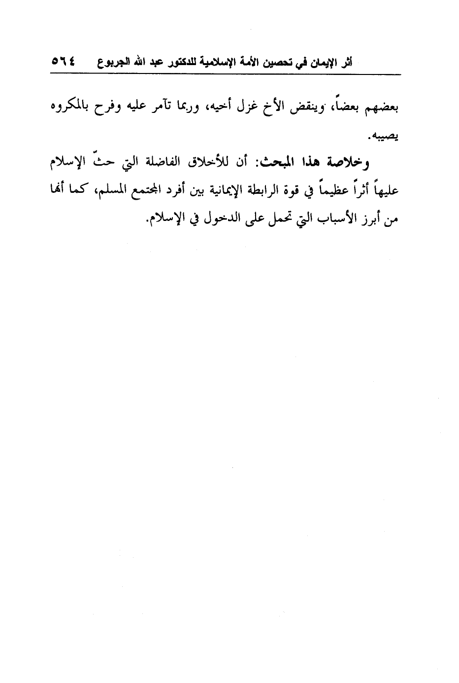 وخلاصة هذا المبحث: أن للأخلاق الفاضلة التي حثّ الإسلام عليهاً أثراً عظيماً في قوة الرابطة الإيمانية بين أفرد المجتمع المسلم، كما أنها من أبرز الأسباب التي تحمل على الدخول في الإسلام.