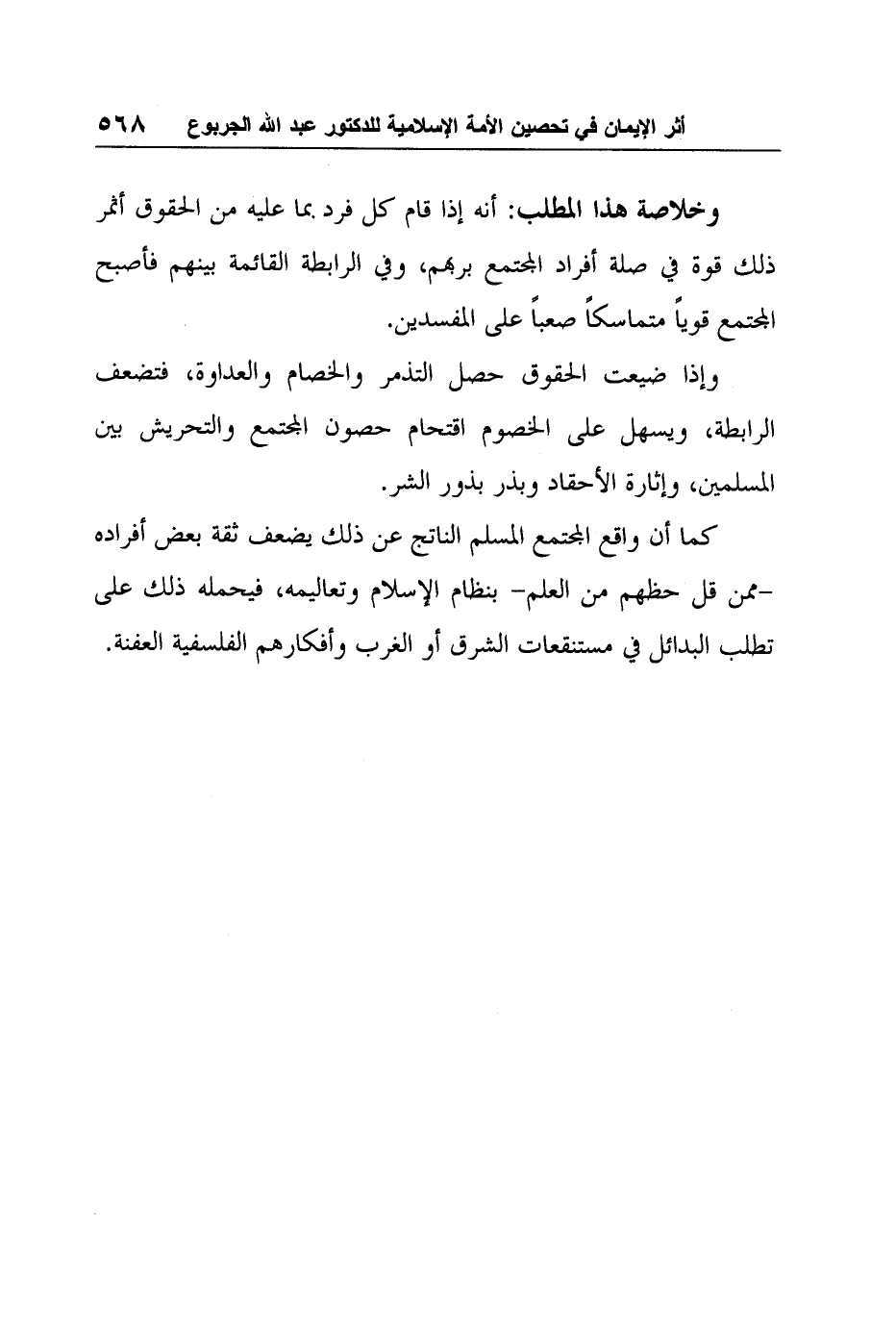 وخلاصة هذا المطلب: أنه إذا قام كل فرد بما عليه من الحقوق أثمر ذلك قوة في صلة أفراد المجتمع بربهم، وفي الرابطة القائمة بينهم فأصبح المجتمع قوياً متماسكاً صعباً على المفسدين.