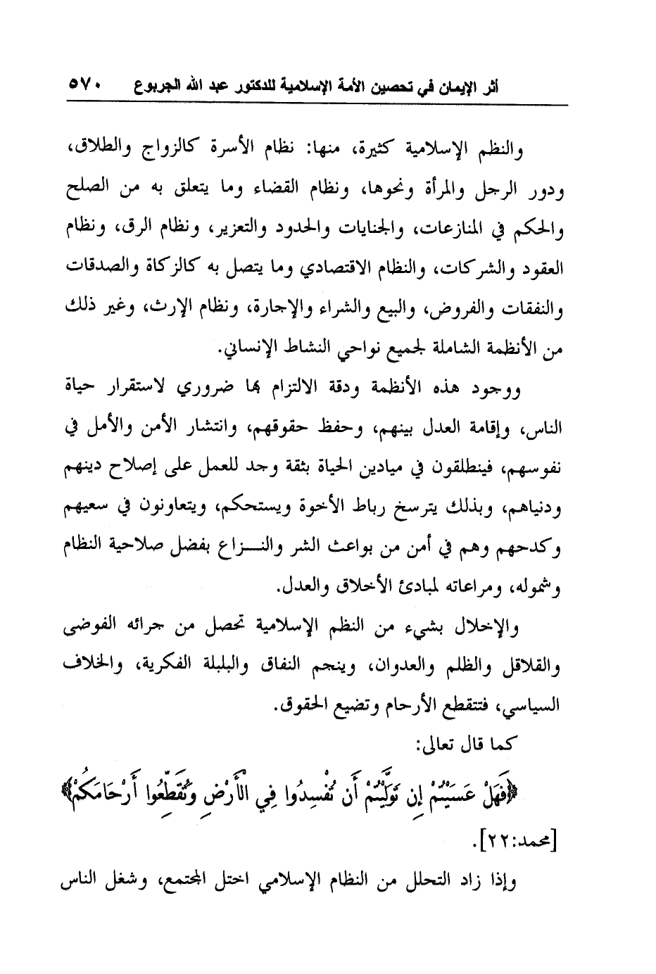 والإخلال بشيء من النظم الإسلامية تحصل من جرائه الفوضى والقلاقل والظلم والعدوان، وينجم النفاق والبلبلة الفكرية، والخلاف السياسي، فتتقطع الأرحام وتضيع الحقوق.