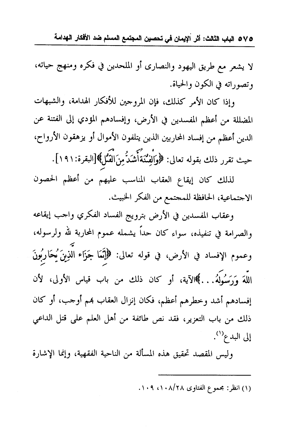 وإذا كان الأمر كذلك، فإن المروجين للأفكار الهدامة، والشبهات المضللة من أعظم المفسدين في الأرض، وإفسادهم المؤدي إلى الفتنة عن الدين أعظم من إفساد المحاربين الذين يتلفون الأموال أو يزهقون الأرواح، حيث تقرر ذلك بقوله تعالى: {وَالْفِتْنَةُ أَشَدُّ مِنَ الْقَتْلِ} [البقرة:191] .
