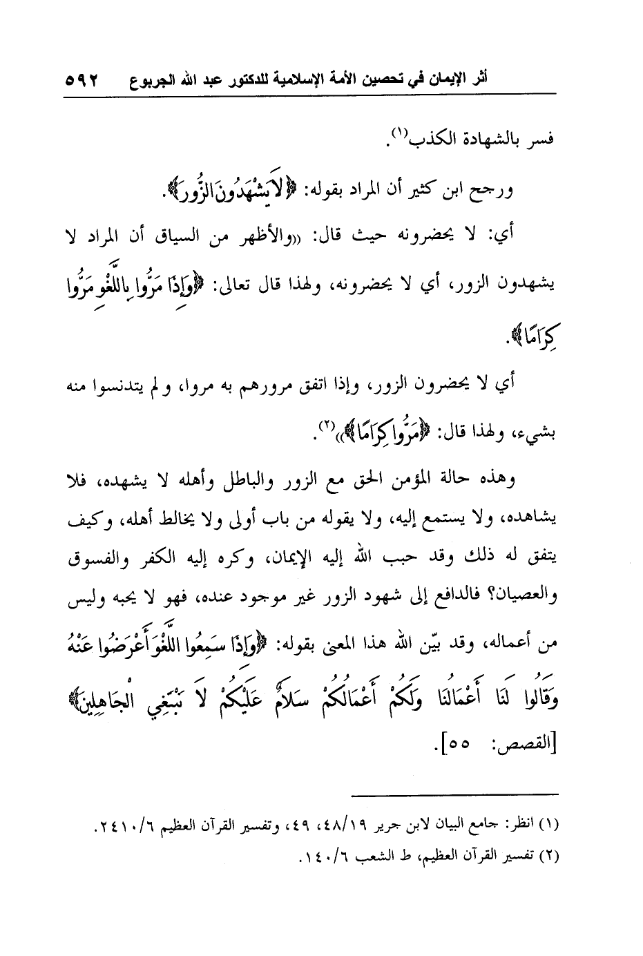 وهذه حالة المؤمن الحق مع الزور والباطل وأهله لا يشهده، فلا يشاهده، ولا يستمع إليه، ولا يقوله من باب أولى ولا يخالط أهله، وكيف يتفق له ذلك وقد حبب الله إليه الإيمان، وكره إليه الكفر والفسوق والعصيان؟ فالدافع إلى شهود الزور غير موجود عنده، فهو لا يحبه وليس من أعماله، وقد بيّن الله هذا المعنى بقوله: {وَإِذَا سَمِعُوا اللَّغْوَ أَعْرَضُوا عَنْهُ وَقَالُوا لَنَا أَعْمَالُنَا وَلَكُمْ أَعْمَالُكُمْ سَلامٌ عَلَيْكُمْ لا نَبْتَغِي الْجَاهِلِينَ} [القصص: 55] .