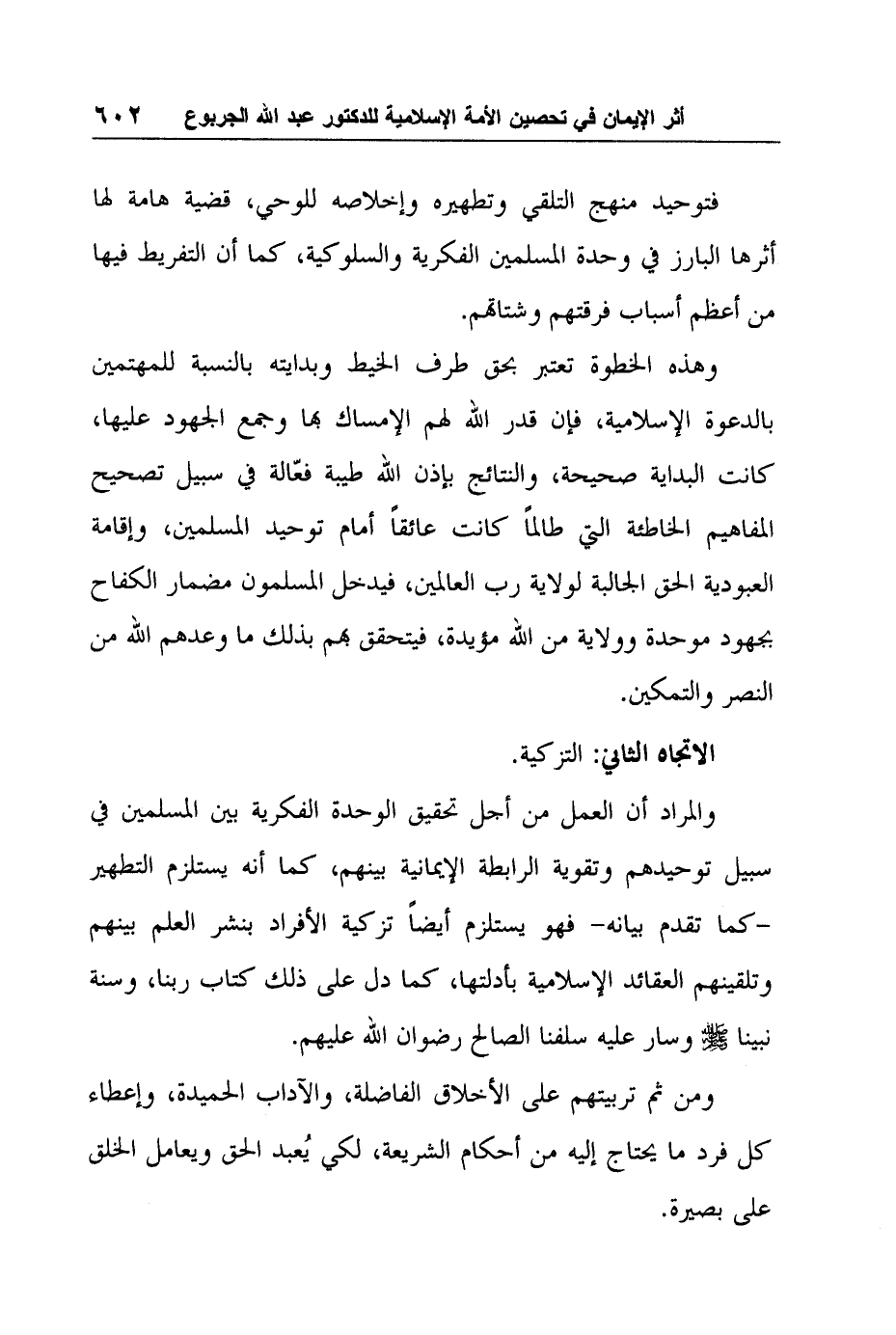 والمراد أن العمل من أجل تحقيق الوحدة الفكرية بين المسلمين في سبيل توحيدهم وتقوية الرابطة الإيمانية بينهم، كما أنه يستلزم التطهير-كما تقدم بيانه- فهو يستلزم أيضاً تزكية الأفراد بنشر العلم بينهم وتلقينهم العقائد الإسلامية بأدلتها، كما دل على ذلك كتاب ربنا، وسنة نبينا صلى الله عليه وسلم وسار عليه سلفنا الصالح رضوان الله عليهم.