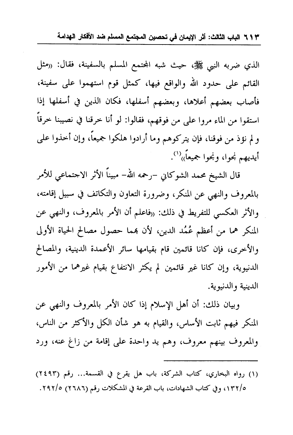 الذي ضربه النبي صلى الله عليه وسلم، حيث شبه المجتمع المسلم بالسفينة، فقال: " مثل القائم على حدود الله والواقع فيها، كمثل قوم استهموا على سفينة، فأصاب بعضهم أعلاها، وبعضهم أسفلها، فكان الذين في أسفلها إذا استقوا من الماء مروا على من فوقهم، فقالوا: لو أنا خرقنا في نصيبنا خرقاً ولم نؤذ من فوقنا، فإن يتركوهم وما أرادوا هلكوا جميعاً، وإن أخذوا على أيديهم نجوا، ونجوا جميعاً "1.