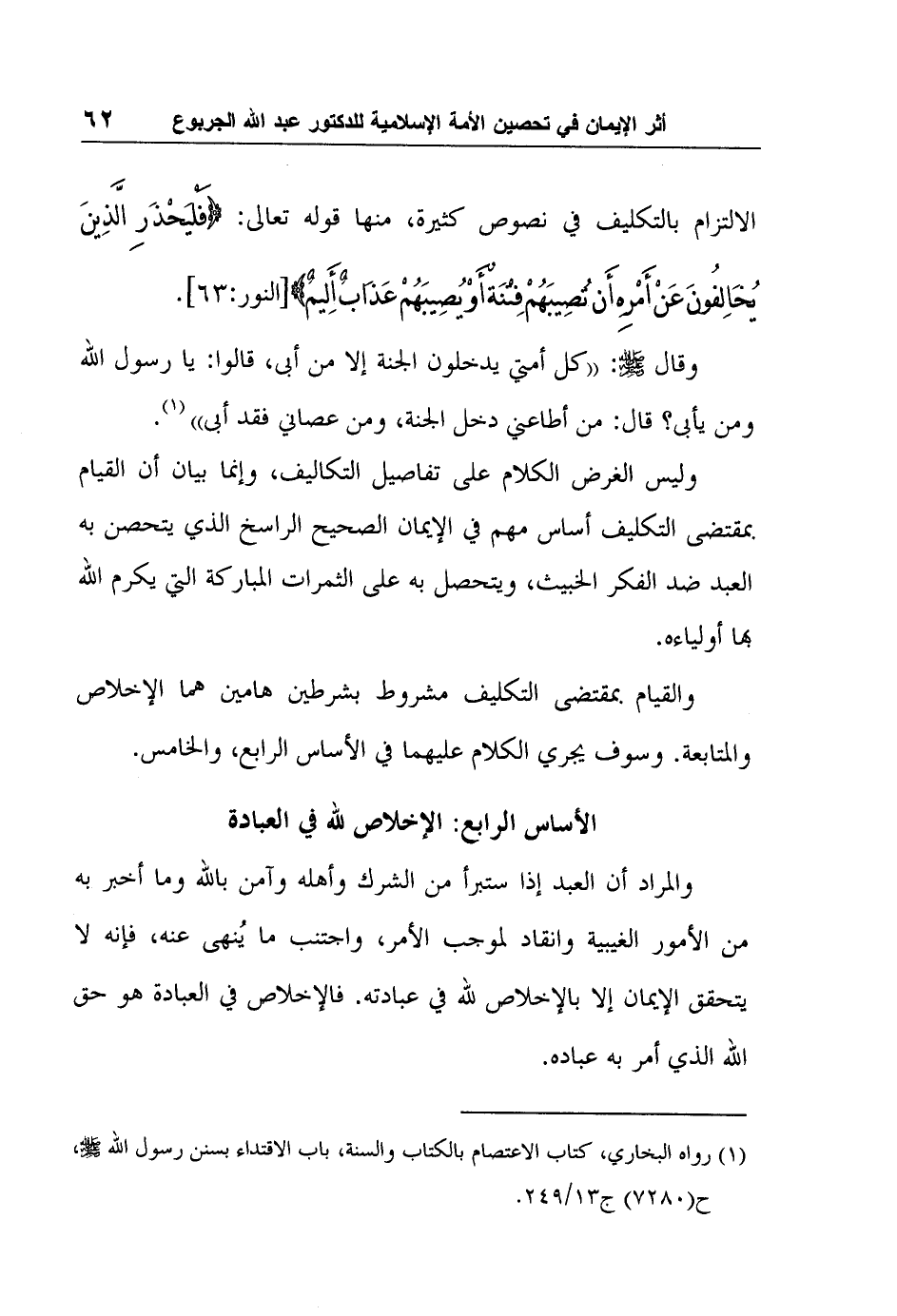 1 رواه البخاري، كتاب الاعتصام بالكتاب والسنة، باب الاقتداء بسنن رسول الله صلى الله عليه وسلم، ح (7280) ج13/249.
