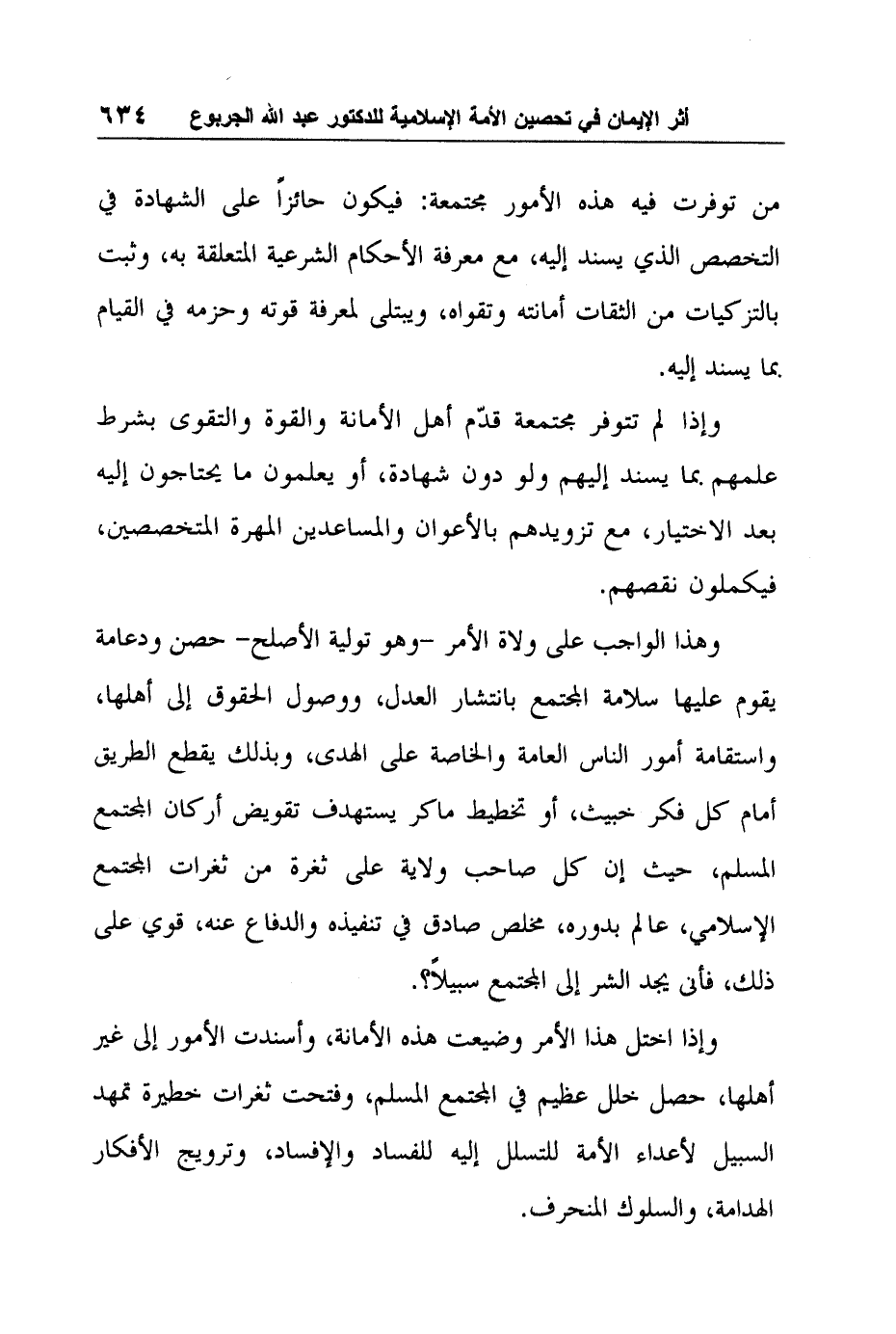 وهذا الواجب على ولاة الأمر -وهو تولية الأصلح- حصن ودعامة يقوم عليها سلامة المجتمع بانتشار العدل، ووصول الحقوق إلى أهلها، واستقامة أمور الناس العامة والخاصة على الهدى، وبذلك يقطع الطريق أمام كل فكر خبيث، أو تخطيط ماكر يستهدف تقويض أركان المجتمع المسلم، حيث إن كل صاحب ولاية على ثغرة من ثغرات المجتمع الإسلامي، عالم بدوره، مخلص صادق في تنفيذه والدفاع عنه، قوي على ذلك، فأنى يجد الشر إلى المجتمع سبيلاً؟.