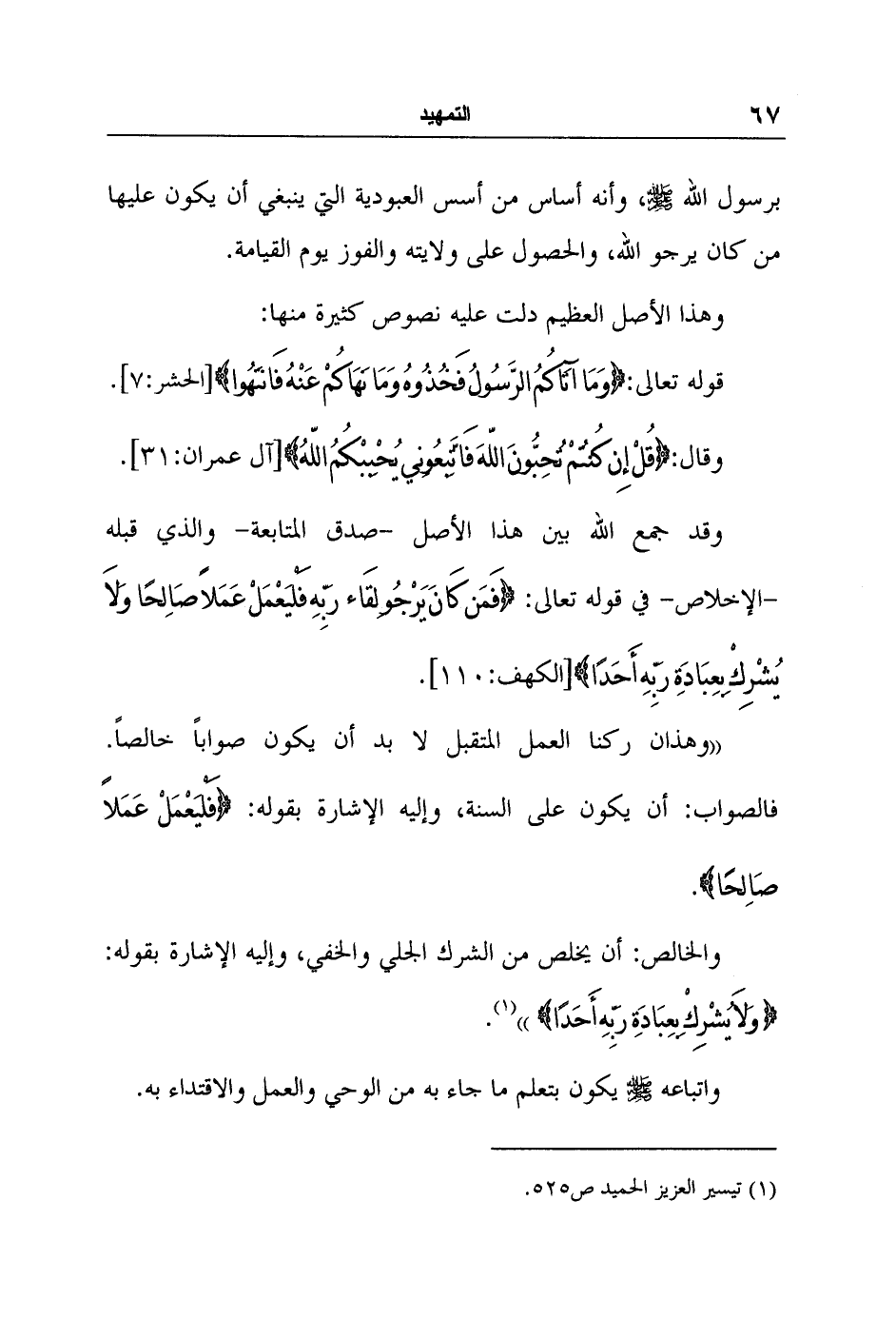 "وهذان ركنا العمل المتقبل لا بد أن يكون صواباً خالصاً. فالصواب: أن يكون على السنة، وإليه الإشارة بقوله: {فَلْيَعْمَلْ عَمَلاً صَالِحًا} .