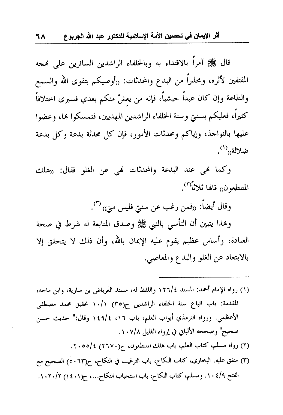 1 رواه الإمام أحمد: المسند 4/126 واللفظ له، مسند العرباض بن سارية، وابن ماجه، المقدمة: باب اتباع سنة الخلفاء الراشدين ح (35) 1/10 تحقيق محمد مصطفى الأعظمي. ورواه الترمذي أبواب العلم، باب 16، 4/149 وقال:" حديث حسن صحيح" وصححه الألباني في إرواء الغليل 8/107.