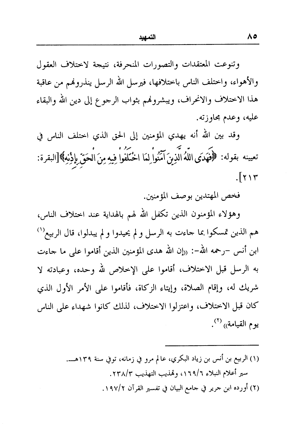 وهؤلاء المؤمنون الذين تكفل الله لهم بالهداية عند اختلاف الناس، هم الذين تمسكوا بما جاءت به الرسل ولم يحيدوا ولم يبدلوا، قال الربيع1 ابن أنس -رحمه الله-: "إن الله هدى المؤمنين الذين أقاموا على ما جاءت به الرسل قبل الاختلاف، أقاموا على الإخلاص لله وحده، وعبادته لا شريك له، وإقام الصلاة، وإيتاء الزكاة، فأقاموا على الأمر الأول الذي كان قبل الاختلاف، واعتزلوا الاختلاف، لذلك كانوا شهداء على الناس يوم القيامة" 2.