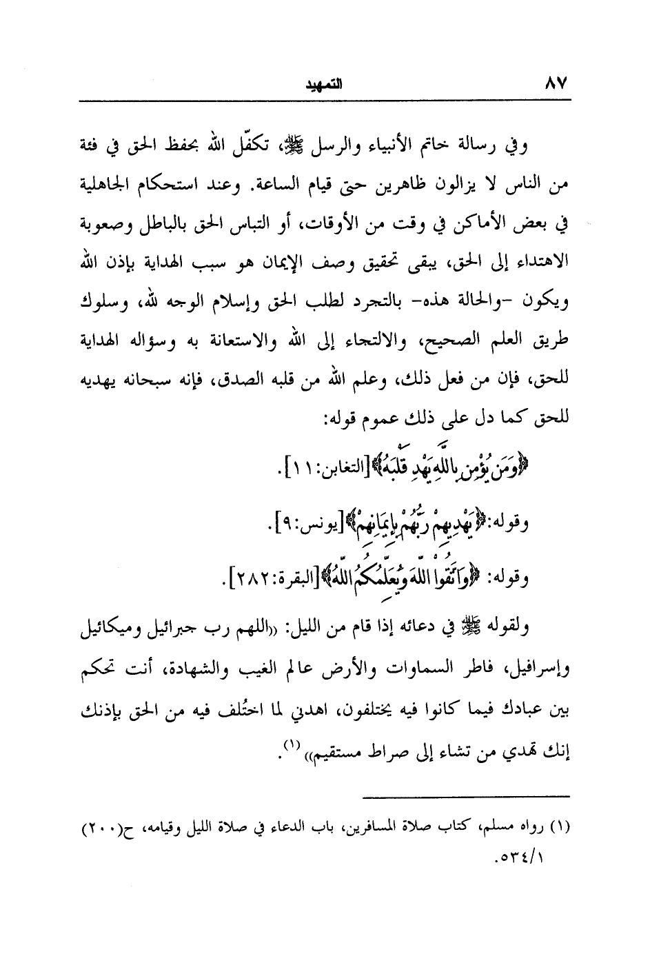 ولقوله صلى الله عليه وسلم في دعائه إذا قام من الليل: " اللهم رب جبرائيل وميكائيل وإسرافيل، فاطر السماوات والأرض عالم الغيب والشهادة، أنت تحكم بين عبادك فيما كانوا فيه يختلفون، اهدني لما اختُلف فيه من الحق بإذنك إنك تهدي من تشاء إلى صراط مستقيم " 1.