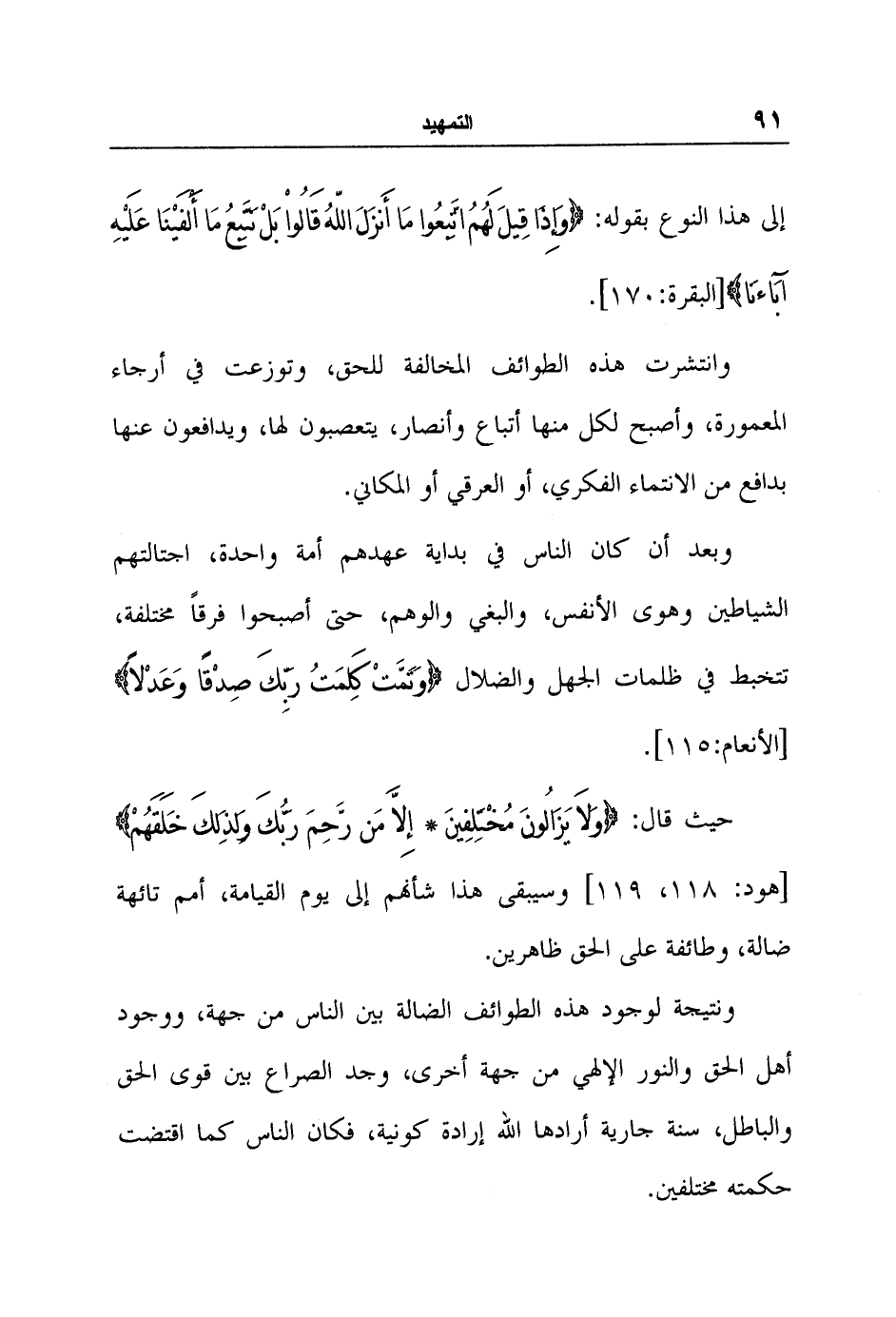 حيث قال: {وَلا يَزَالُونَ مُخْتَلِفِينَ إِلاَّ مَنْ رَحِمَ رَبُّكَ وَلِذَلِكَ خَلَقَهُمْ} [هود: 118، 119] وسيبقى هذا شأنهم إلى يوم القيامة، أمم تائهة ضالة، وطائفة على الحق ظاهرين.