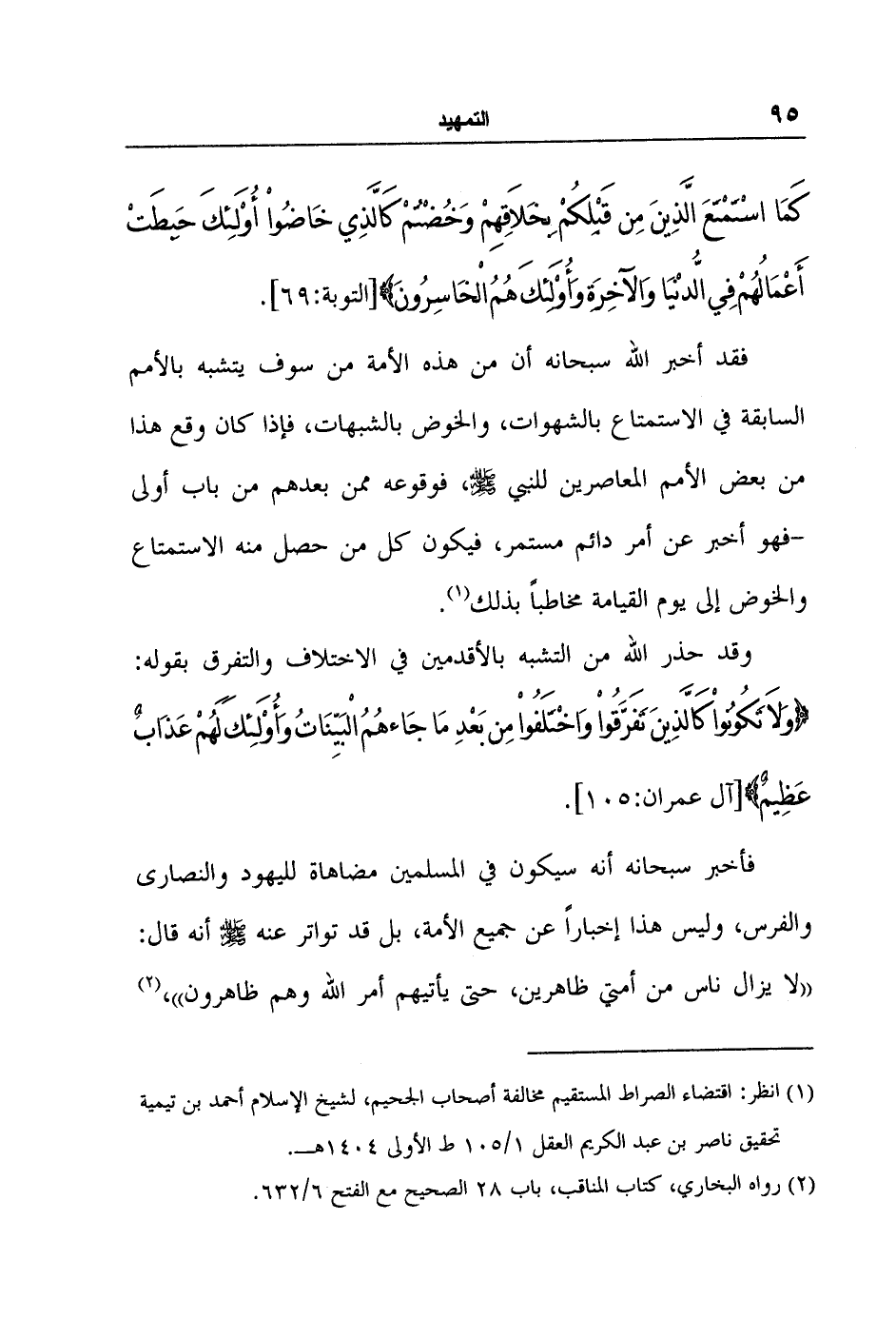 فأخبر سبحانه أنه سيكون في المسلمين مضاهاة لليهود والنصارى والفرس، وليس هذا إخباراً عن جميع الأمة، بل قد تواتر عنه صلى الله عليه وسلم أنه قال: " لا يزال ناس من أمتي ظاهرين، حتى يأتيهم أمر الله وهم ظاهرون "،2
