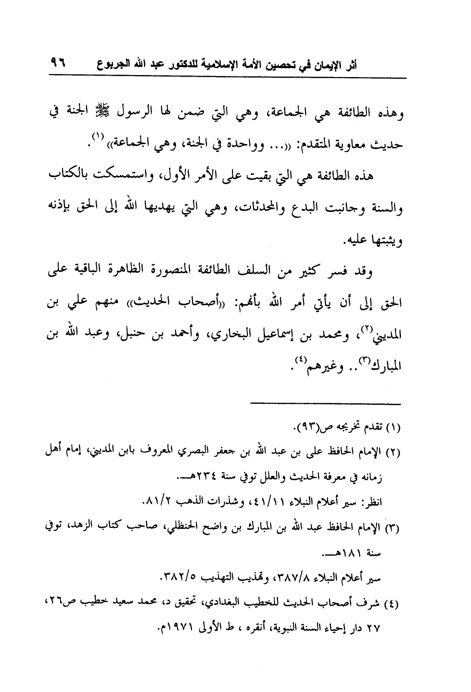 وقد فسر كثير من السلف الطائفة المنصورة الظاهرة الباقية على الحق إلى أن يأتي أمر الله بأنهم: أصحاب الحديث منهم علي بن المديني2، ومحمد بن إسماعيل البخاري، وأحمد بن حنبل، وعبد الله بن المبارك3.. وغيرهم4.