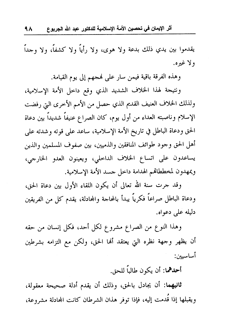 وهذا النوع من الصراع مشروع لكل أحد، فكل إنسان من حقه أن يظهر وجهة نظره التي يعتقد أنها الحق، ولكن مع التزامه بشرطين أساسيين: