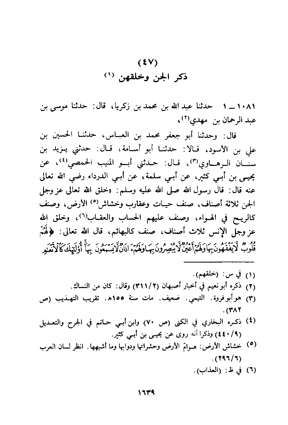 حَدَّثَنَا عَبْدُ اللَّهِ بْنُ مُحَمَّدِ بْنِ زَكَرِيَّا قَالَ: حَدَّثَنَا مُوسَى بْنُ عَبْدِ الرَّحْمَنِ بْنِ مَهْدِيٍّ قَالَ: وَحَدَّثَنَا أَبُو جَعْفَرٍ مُحَمَّدُ بْنُ الْعَبَّاسِ، حَدَّثَنَا الْحُسَيْنُ بْنُ عَلِيِّ بْنِ الْأَسْوَدِ قَالَا: حَدَّثَنَا أَبُو أُسَامَةَ قَالَ: حَدَّثَنِي يَزِيدُ بْنُ سِنَانٍ الرَّهَاوِيُّ قَالَ: حَدَّثَنِي أَبُو الْمُنِيبِ الْحِمْصِيُّ، عَنْ يَحْيَى بْنِ أَبِي كَثِيرٍ، عَنْ أَبِي سَلَمَةَ، عَنْ أَبِي الدَّرْدَاءِ رَضِيَ اللَّهُ تَعَالَى عَنْهُ قَالَ: قَالَ رَسُولُ اللَّهِ صَلَّى اللهُ عَلَيْهِ وَسَلَّمَ: §" خَلَقَ اللَّهُ تَعَالَى عَزَّ وَجَلَّ الْجِنَّ ثَلَاثَةَ أَصْنَافٍ صِنْفٌ حَيَّاتٌ وَعَقَارِبُ وَخَشَاشُ الْأَرْضِ، وَصِنْفٌ كَالرِّيحِ فِي الْهَوَاءِ، وَصِنْفٌ عَلَيْهِمُ الْحِسَابُ وَالْعِقَابُ، وَخَلَقَ اللَّهُ عَزَّ وَجَلَّ الْإِنْسَ ثَلَاثَةَ أَصْنَافٍ صِنْفٌ كَالْبَهَائِمِ قَالَ اللَّهُ تَعَالَى {لَهُمْ قُلُوبٌ لَا يَفْقَهُونَ بِهَا وَلَهُمْ أَعْيُنٌ لَا يُبْصِرُونَ بِهَا وَلَهُمْ آذَانٌ لَا يَسْمَعُونَ بِهَا أُولَئِكَ كَالْأَنْعَامِ بَلْ هُمْ أَضَلُّ} [الأعراف: 179]