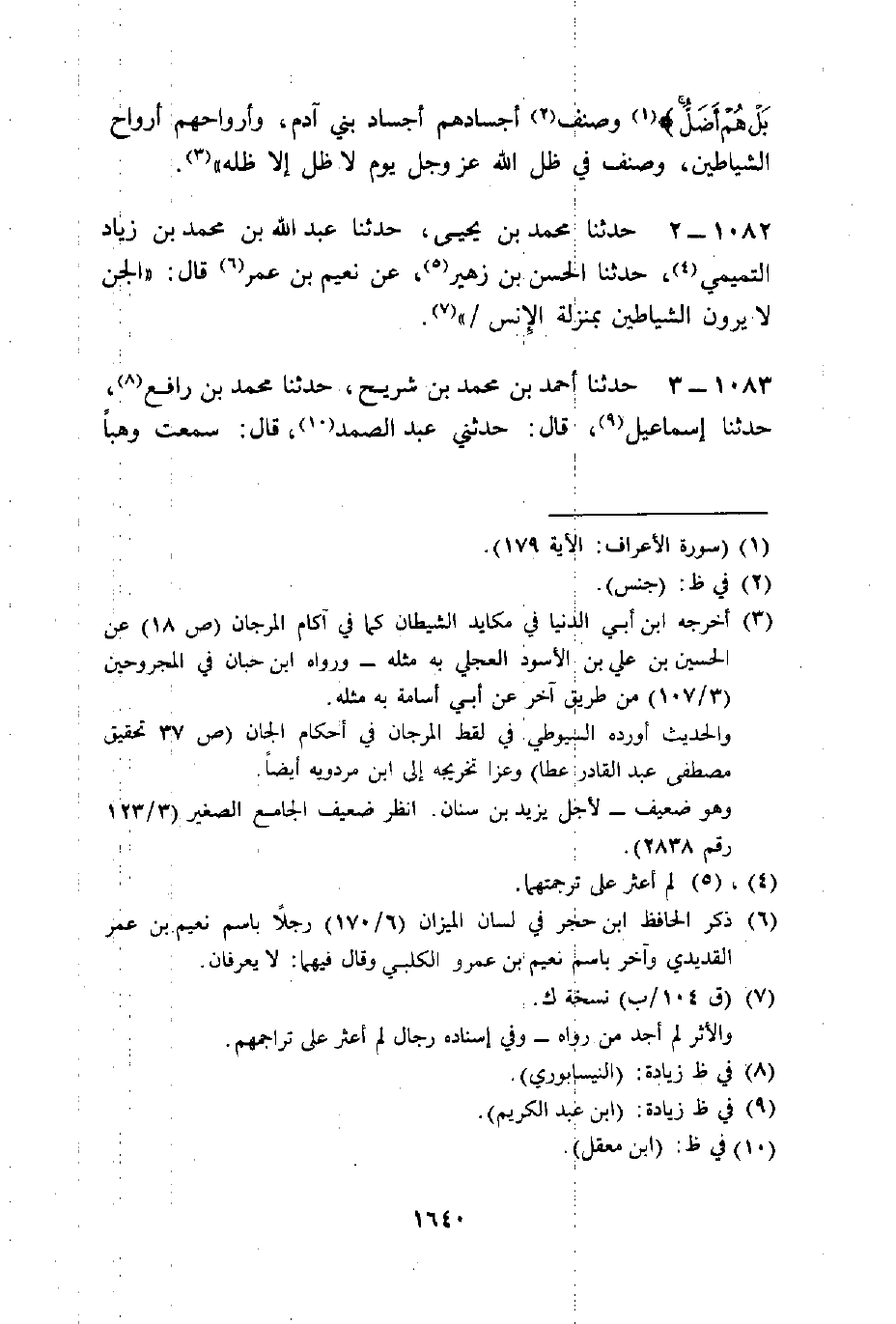 حَدَّثَنَا مُحَمَّدُ بْنُ يَحْيَى، حَدَّثَنَا عَبْدُ اللَّهِ بْنُ مُحَمَّدِ بْنِ زِيَادٍ التَّمِيمِيُّ، حَدَّثَنَا الْحَسَنُ بْنُ زُهَيْرٍ، عَنْ نُعَيْمِ بْنِ عُمَرَ قَالَ: §«الْجِنُّ لَا يَرَوْنَ الشَّيَاطِينَ بِمَنْزِلَةِ الْإِنْسِ»