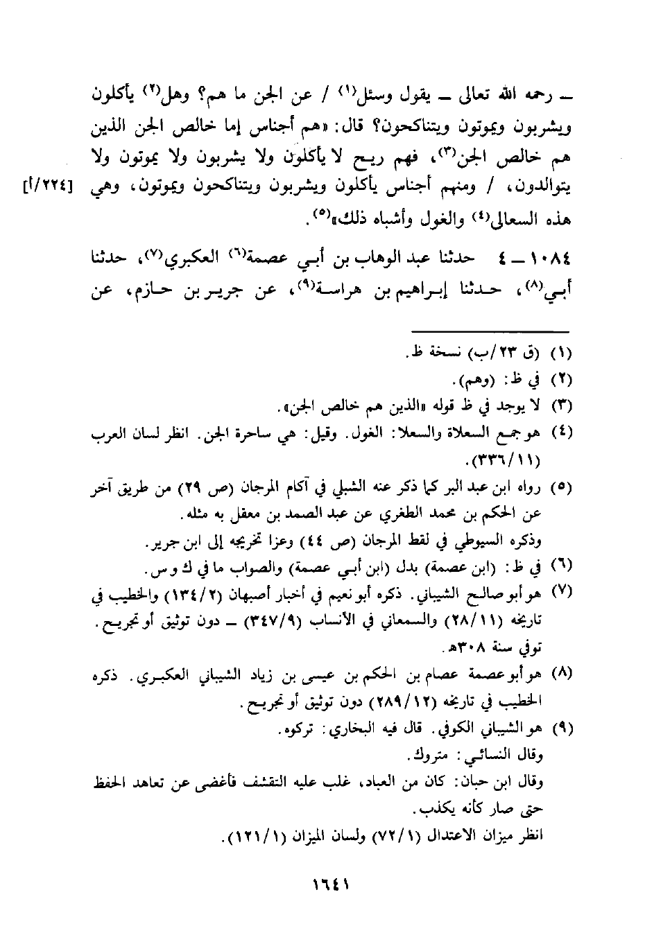 حَدَّثَنَا عَبْدُ الْوَهَّابِ بْنُ أَبِي عِصْمَةَ الْعُكْبَرِيُّ، حَدَّثَنَا أَبِي، حَدَّثَنَا إِبْرَاهِيمُ بْنُ هِرَاسَةَ، عَنْ جَرِيرِ بْنِ حَازِمٍ، عَنْ -[1642]- عَبْدِ اللَّهِ بْنِ عُبَيْدٍ، عَنْ جَابِرٍ رَضِيَ اللَّهُ عَنْهُ قَالَ: سُئِلَ رَسُولُ اللَّهِ صَلَّى اللهُ عَلَيْهِ وَسَلَّمَ عَنِ الْغِيلَانِ، فَقَالَ: §«سَحَرَةُ الْجِنِّ»